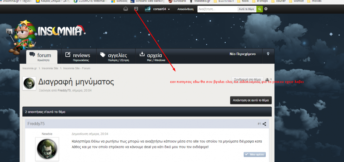 corsair04 Δημοσ. 7 Δεκεμβρίου 2016 Δημοσ. 7 Δεκεμβρίου 2016 Καλησπέρα.Θέλω να ρωτήσω πως μπορώ να αναζητήσω κάποιον μέσα στο site του οποίου τα μηνύματα διέγραψα κατα λάθος και με τον οποίο επρόκειτο να κάνουμε deal για κάτι δικό μου που τον ενδιέφερε! μπορείς εάν δεν έχεις διαγράψει τις ειδοποιήσεις γράφει μέρα και ώρα και όνομα μέλους (δες φώτο) 1