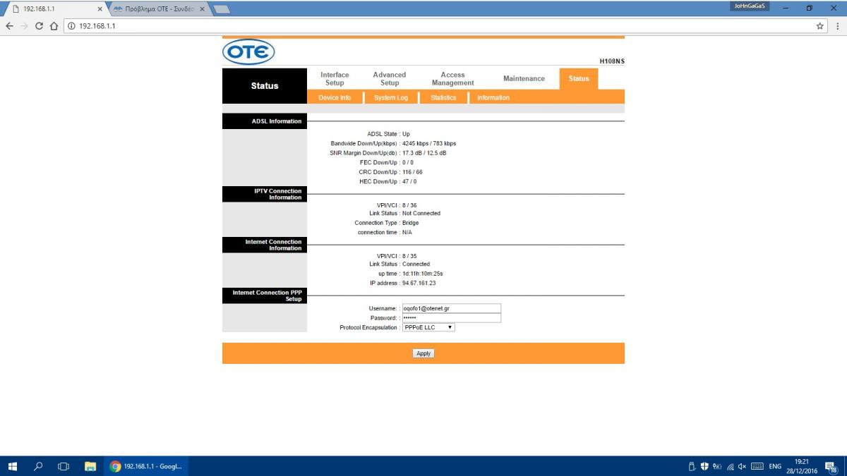 GaGaS_Thess Δημοσ. 27 Δεκεμβρίου 2016 Δημοσ. 27 Δεκεμβρίου 2016 Καλημέρα και χρόνια πολλά . Αποφάσισα έπειτα απο 11 χρόνια στην Forthnet να πάω στον ΟΤΕ . Έκανα την αίτηση ενεργοποιήθηκε όλα καλά . Παρέλαβα την Τετάρτη το router το έβαλα πάνω και εκεί που με την Forthnet είμουν στα 7 ~ 9 μια ζωή βλέπω κάτι νούμερα στον ΟΤΕ εξωφρενικά του στυλ 1,6 ( !!!!!!!!!! ) εώς 4 MBPS εκτός απο 3 φορές που έπειτα απο καμμιά 10 αριά επανεκινήσεις του router έπιασε 10,8 ( !!!!!!! ) αλλά μετά απο 3 ώρες έπεσε η γραμμή και επανήλθε στα 1,8 ..................Μίλησα με τον ΟΤΕ μου είπαν να αλλάξω τα φίλτρα της Forthnet Και να βάλω αυτά που μου έστειλαν . Το έκανα και άλλαξα ως και τα καλώδια του τηλεφώνου ........ ! Μια απο τα ίδια ..... Τι να κάνω !??!?!?!!