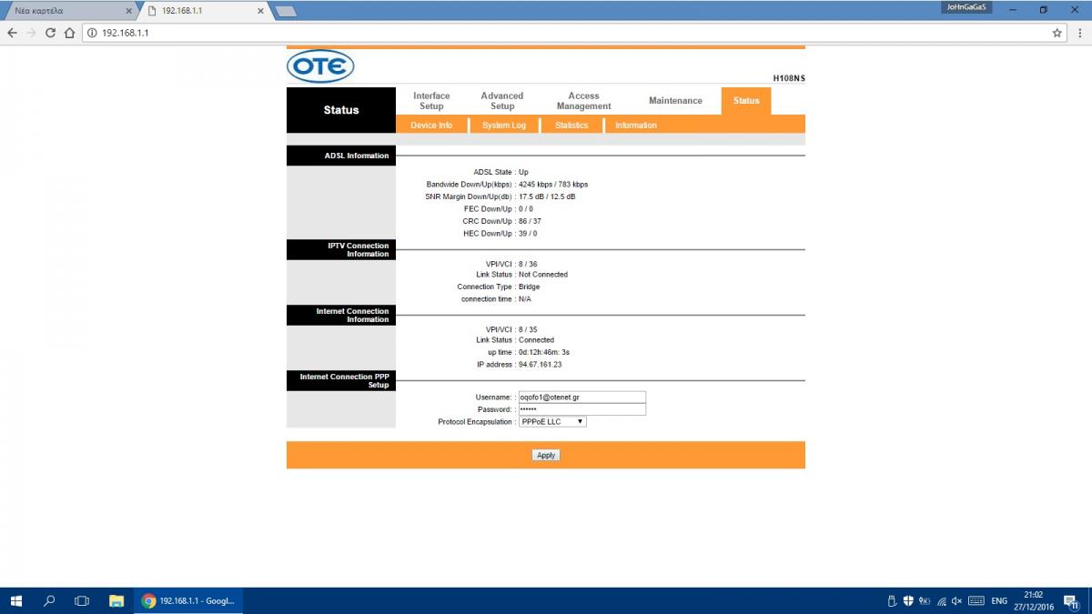 Xristaras12 Δημοσ. 27 Δεκεμβρίου 2016 Δημοσ. 27 Δεκεμβρίου 2016 ανέβασε τα στατιστικά του μόντεμ για αρχή να δούμε. Υπόψιν οτι με οτε θα βλέπεις και χαμηλότερες τιμές του 7-9 μιας και δίνει υψηλότερο snr