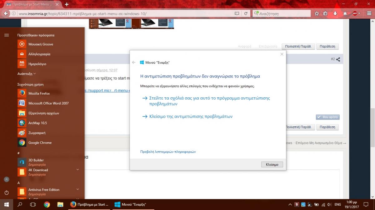 MrPanozzz Δημοσ. 19 Ιανουαρίου 2017 Μέλος Δημοσ. 19 Ιανουαρίου 2017 Δοκίμασε να τρέξεις το start menu troubleshooter https://support.microsoft.com/en-us/help/12385/windows-10-troubleshoot-problems-opening-start-menu-cortana Σ' ευχαριστώ για την απάντηση αλλά δυστυχώς τίποτα, δεν βρίσκει πρόβλημα λέει. Και απ' ότι βλέπω και σ' αυτόν τον οδηγό σαν επόμενη λύση δίνει την δημιουργία νέου προφίλ χρήστη και την μεταφορά των αρχείων εκεί.