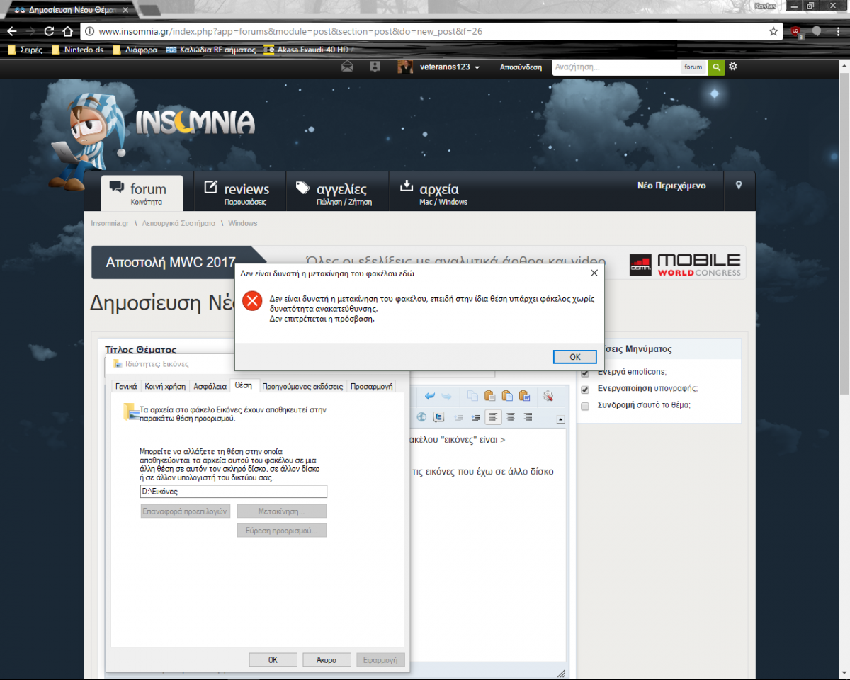 veteranos123 Δημοσ. 26 Φεβρουαρίου 2017 Δημοσ. 26 Φεβρουαρίου 2017 Καλημέρα, έχω κάνει εγκατάσταση τα windows 10 και η διαδρομή του φακέλου "εικόνες" είναι > C:\Users\kosta\OneDrive\Εικόνες Εγώ θέλω να αλλάξω την διαδρομή του φακέλου "εικόνες" και να δείχνει τις εικόνες που έχω σε άλλο δίσκο οπότε η διαδρομή που θέλω να βάλω είναι -> D:\Εικόνες αλλά όταν πετάω "εφαρμογή παίρνω το παρακάτω μήνυμα Πως μπορώ να αλλάξω την διαδρομή. Την ίδια διαδικασία έκανα και για τον φάκελο "Μουσική" χωρίς κανένα πρόβλημα. Ευχαριστώ.