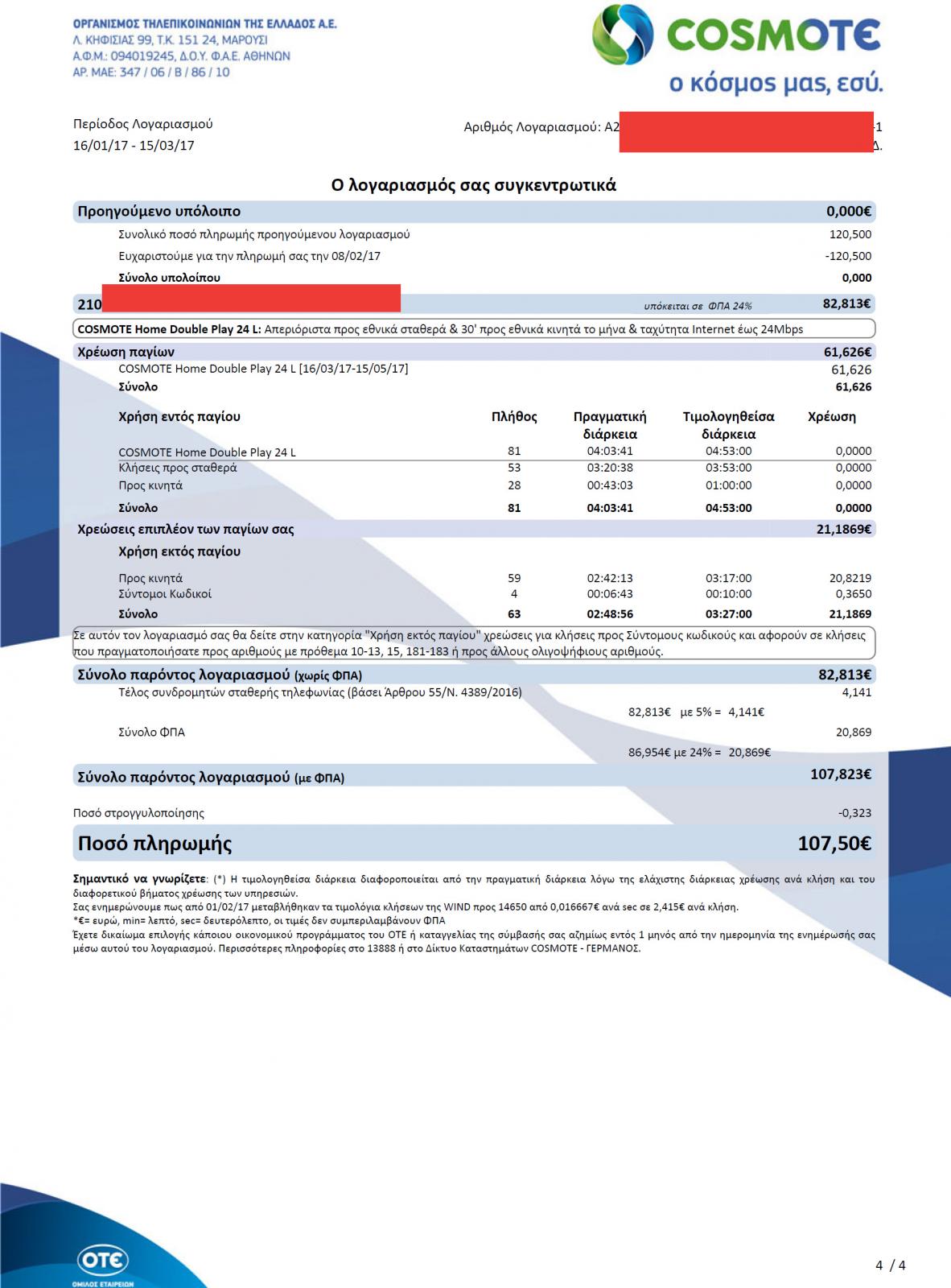 l337 Δημοσ. 23 Απριλίου 2017 Δημοσ. 23 Απριλίου 2017 Σύμφωνα με το site της Cosmote στις τιμές Home DOuble Play 24L (όπως αυτή που έχω στο σπίτι μου) υπάρχει μηνιαίο πάγιο που περιλαμβάνει ΦΠΑ. Το ίδιο γράφει και η αίτηση που πρέπει να συμπληρώσει κάποιος για να συνδεθεί στο πακέτο. Όμως στην πράξη το πακέτο ξαναχρεώνεται με ΦΠΑ. Στην περίπτωσή μου θα έπρεπε να είναι 61,626 + 0% ΦΠΑ και 21,1869 Χ24% = 26,264 + 4,141 το τέλος συνολικά πληρωτέο 91,92 και όχι 107,50. Πως βρίσκει κανείς άκρη? Συνάπτω τα σχετικά. Ευχαριστώ Καλώντας στο 13888. 1
