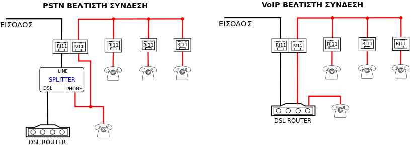 jkoukos Δημοσ. 26 Απριλίου 2017 Δημοσ. 26 Απριλίου 2017 Στο παρακάτω σχέδιο εμφανίζεται η συνηθισμένη παράλληλη συνδεσμολογία, που στην περίπτωση του VoIP γίνεται επιστροφή. Πρόσεξε την σύνδεση του splitter. Σε αυτό το σχέδιο εμφανίζεται ποια είναι η βέλτιστη σύνδεση. 2