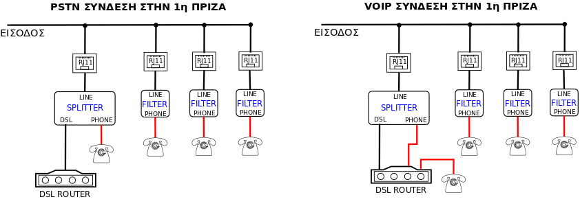jkoukos Δημοσ. 26 Απριλίου 2017 Δημοσ. 26 Απριλίου 2017 Η πρώτη εικόνα παίζει και στην περίπτωση που το modem router είναι σε άλλη πρίζα εκτός της πρώτης. Σε οποιαδήποτε περίπτωση της 1ης εικόνας, τα φίλτρα πριν από κάθε τηλεφωνική συσκευή (και συναγερμό) είναι απαραίτητα, καθώς είτε σε TDM είτε σε VoIP τηλεφωνία, έχουμε μίξη των 2 σημάτων (τηλεφωνία και DSL) που δημιουργεί πρόβλημα.