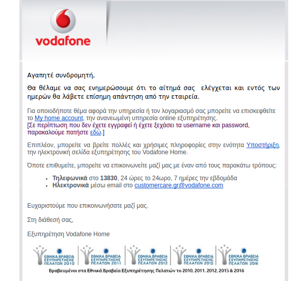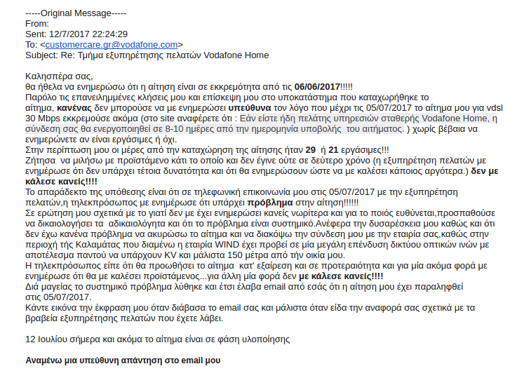 stormwave Δημοσ. 14 Ιουλίου 2017 Δημοσ. 14 Ιουλίου 2017 Αγαπητοί φίλοι καλημέρα σας! Θα ήθελα να μοιραστώ μαζί σας την κωμικοτραγική περιπέτεια μου με την vodafone σχετικά με μία αναβάθμιση γραμμής σε VDSL 30Mbps. Διαμένω στην περιοχή της καλαμάτας και είμαι υφιστάμενος πελάτης στο home double play (ADSL 24 24Mbps) από τον φεβρουάριο του 2016. Καταχώρηθηκε αίτημα στίς 06/06/2017 και μέχρι και χθές (13/07/2017) δεν είχε ακόμα υλοποιηθεί (μερική υλοποίηση καθώς δεν έχω τηλέφωνο). Modem/Router έλαβα περίπου 10 μέρες μετά την καταχώρηση,επί καθημερινής βάσεως έλεγχα το my home account και πάντα η ενημέρωση ήταν ότι το αίτημα είναι σε φάση υλοποίησης. Το ίδιο με ενημέρωναν και από το υποκατάστημα (2 επισκέψεις) και από το τμήμα εξυπηρέτησης πελατών (3 επικοινωνίες) χωρίς καμία διευκρίνηση. Στη δεύτερη επικοινωνία μου με το τμήμα εξυπηρέτησης πελατών στο τέλος ιουνίου ζήτησα να μιλήσω με προϊστάμενο,με ενημέρωσαν ότι δεν υπάρχει αυτή η δυνατότητα και ότι θα ενημερώσουν να με καλέσει κάποιος σε δεύτερο χρόνο,σωστά μαντέψατε δεν με κάλεσε ποτέ κανείς!!! Ξανακάλεσα στίς 05/07/2017 και για άλλη μια φορά πάλι η ίδια ενημέρωση ώσπου εκεί πλέον εκφράζω την δυσαρέσκεια μου και απαιτώ μία υπεύθυνη απάντηση για τον λόγο που καθυστερεί η υλοποίηση του αιτηματός μου.Μετά απο αρκετή ώρα στην αναμονή με ενημερώνουν ότι υπάρχει πρόβλημα στην αίτηση!!! Σε ερώτηση μου σχετικά με το γιατί δεν με έχει ενημερώσει κανείς νωρίτερα και για το ποιός ευθύνεται,η τηλεκπρόσωπος προσπαθούσε να δικαιολογήσει τα αδικαιολόγητα και ότι το πρόβλημα είναι συστημικό. Ανέφερα την δυσαρέσκεια μου καθώς και ότι δεν έχω κανένα πρόβλημα να ακυρώσω το αίτημα και να διακόψω την σύνδεση μου,καθώς στην περιοχή τής Καλαμάτας που διαμένω η εταιρία WIND έχει προβεί σε μία μεγάλη επένδυση δικτύου οπτικών ινών με αποτέλεσμα παντού να υπάρχουν KV και μάλιστα 150 μέτρα από τήν οικία μου. Η τηλεκπρόσωπος είπε ότι θα προωθήσει το αίτημα κατ' εξαίρεση και σε προτεραιότητα και για μία ακόμα φορά με ενημέρωσε ότι θα με καλέσει προϊστάμενος...για άλλη μία φορά δεν με κάλεσε κανείς. Διά μαγείας το συστημικό πρόβλημα λύθηκε και έτσι έλαβα email ότι η αίτηση μου έχει παραληφθεί στις 05/07/2017. Παραθέτω το email που έστειλα στις 12/07/2017 στην εξυπηρέτηση πελατών ενημερώνοντας για το θέμα μου και την απάντηση που έλαβα στις 13/07/2017 (1.04 μ.μ) Χθές από το πρωί όλα ήταν down,ούτε τηλέφωνο,ούτε internet. Kάλεσα το μεσημέρι την τεχνική υποστήριξη (μεγάλη αναμονή,άφησα μνμ να με καλέσουν,με κάλεσαν μετά από 45 λεπτά) ενημέρωσα για το θέμα αναμονής VDSL και ρώτησα αν έχει σχέση,μήπως αυτό γίνεται λόγω της ενεργοποίησης της.Μου είπαν ότι η γραμμή είναι ακόμα ADSL και ότι δεν έχει σχέση το ένα θέμα με το άλλο. Mετά από ελέγχους που έκανε ο "τεχνικός" δηλώθηκε βλάβη και καταχώρησε εκτροπή των εισερχόμενων κλήσεων του σταθερού στο κινητό μου.Με ενημέρωσε να έχω το νού μου στο modem/router για το internet και ότι η βλάβη θα αποκατασταθεί (αόριστος για το πότε). To απόγευμα το internet "ήρθε"!!! γραμμη; VDSL 30Mbps! τι να πώ!!! ότι έπρεπε να στείλω νωρίτερα email; ότι και ο άγιος φοβέρα θέλει; ότι δεν ξέρουν τι τους γίνεται; κ.α τηλέφωνο ακόμα δεν έχω,πρέπει να πάρω ξανά την τεχνική υποστήριξη για το θέμα αυτό. Αυτή είναι η "περιπέτεια" μου με την vodafone,συγγνώμη για το μακροσκελές κείμενο. Τα συμπεράσματα δικά σας....