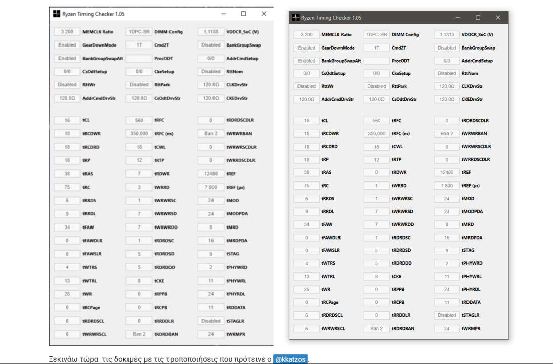 kkatzos Δημοσ. 26 Απριλίου 2020 Δημοσ. 26 Απριλίου 2020 (επεξεργασμένο) 7 ώρες πριν, MORBID21 είπε Τα δικα μου XMP με τις ιδιες μνημες.οι διαφορες μας γιατι υπαρχουν?δεν θα επρεπε να ειναι εντελως ιδια τα προφιλ? Το XMP περιέχει 4-5 timings μόνο. Όλα τα υπόλοιπα μπαίνουν αυτόματα από τη μητρική/BIOS. 7 ώρες πριν, MORBID21 είπε στην ουσια ακολουθω ακριβως τα βηματα που σου ειπαν και οι προηγουμενοι εμενα δεν παιζει ουτε την safe του dram calculator στα 3400 με 16-19-19-19 και όλα στο Auto σου δούλεψε; 10 ώρες πριν, bebius είπε Το tRFC έτρεξε 5 κύκλους ΤΜ5 στα 515. Στα 500 fail με τη μία. Άρα μπορεί να βρήκες το πρόβλημα σου. Θα μπορούσες να δοκιμάσεις και τα Fast timings με tRFC 60-70 πάνω από όσο δίνει το calculator. Γενικά σκοπός σου είναι τα xxxxxSCL να είναι 4/4 (ή 3/3 αν είσαι τυχερός) και τα tRRDS/tRRDL 4/6 και το tFAW = 4 x tRRDS (δηλ. 16) Και δοκίμασε και το tRCDRD στο 18 που βλέπω δουλεύει σε πολλούς με CJR . Επεξ/σία 26 Απριλίου 2020 από kkatzos 2 1