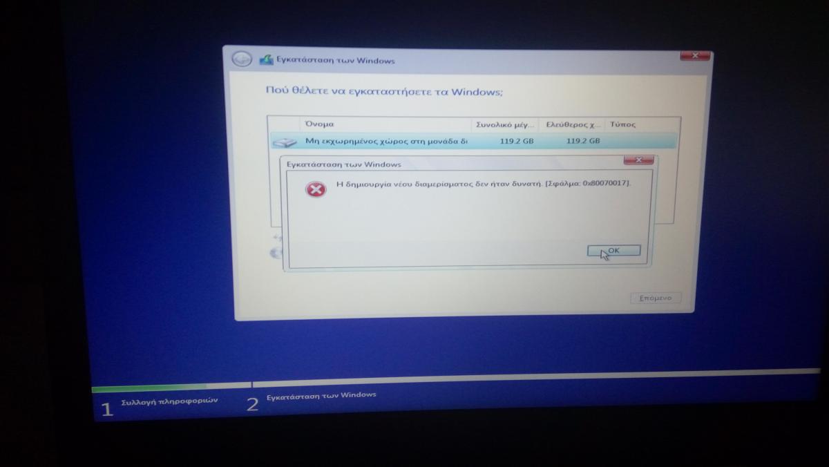 johnarasss Δημοσ. 25 Σεπτεμβρίου 2017 Δημοσ. 25 Σεπτεμβρίου 2017 Καλησπέρα, αγόρασα ένα laptop Lenovo χωρίς OS αλλά δεν έχω καταφέρει να εγκαταστήσω τα Windows 10. Στο στάδιο που πρέπει να επιλέξω σε ποιό σκληρό θα γίνει η εγκατάσταση μου λέει "Η δημιουργία νέου διαμερίσματος δεν ήταν δυνατή. (Σφάλμα: 0x80070017). Επίσης στο κάτω μέρος γράφει: "Δεν είναι δυνατή η εγκατάσταση των windows σε αυτήν τη μονάδα δίσκου." Πρέπει να κάνω αλλαγές στο BIOS; (Το controller mode είναι ήδη σε AHCI). Σας ευχαριστώ.