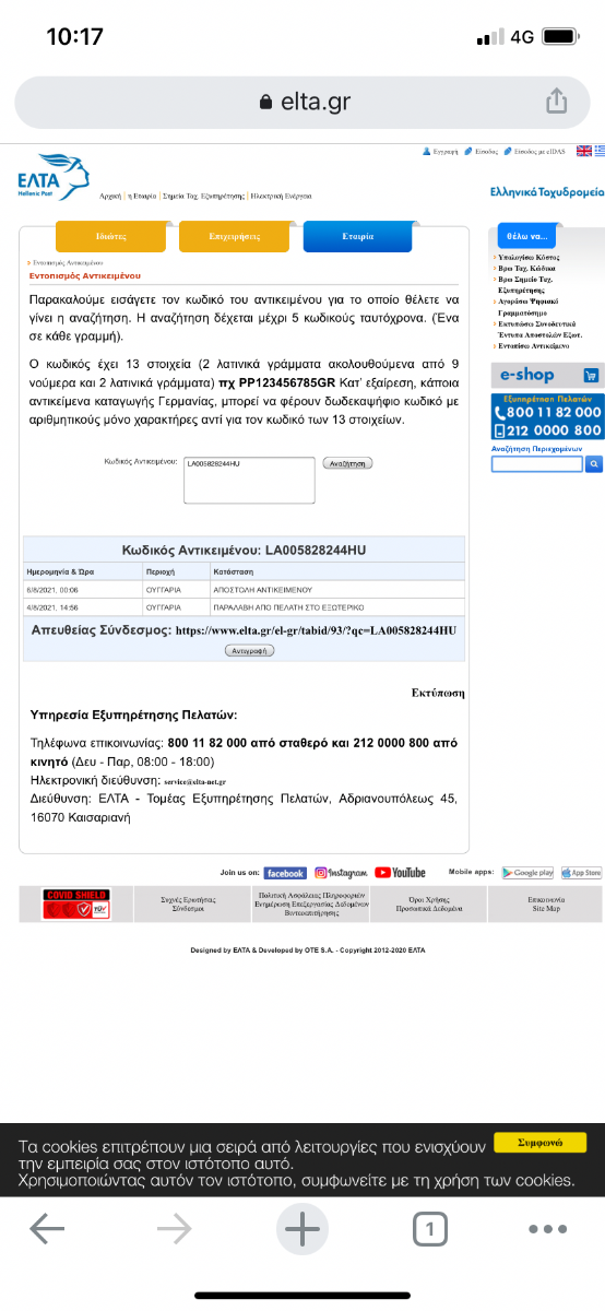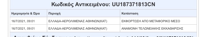 vasilispas Δημοσ. 21 Αυγούστου 2021 Δημοσ. 21 Αυγούστου 2021 13 λεπτά πριν, Viviandg είπε Λοιπόν όσες φορές έχω πάρει στα ΕΛΤΑ τηλέφωνο ο μου λένε διαφορετικά ανάλογα με το ποιος υπάλληλος το σηκώνει την τελευταία φορά λοιπόν για το συγκεκριμένο δέμα μ είπαν ότι αυτοί βλέπουν ότι δεν είναι πλέον στο αεροδρόμιο έχει φύγει προς τ τοπικό ταχυδρομείο και να το ψάξω εκεί αν δεν υπάρχει εκεί μου έδωσαν ένα τηλ 2103538144 να πάρω εκεί πήρα τηλ στο τοπικό ταχυδρομείο μου λένε όχι δεν εχοθμε κάτι και στην συνέχεια όταν κάλεσαν το τηλ π μ έδωσαν δεν τ σήκωνε κανείς Εμενα σαν το δικο σου ειναι απο 17/8...αναμονη τελωνειακης εκκαθαρισης...ολοι μου λενε δν εχει ανοιχτει ο σακος..αναμονη σε τελωνειο 16 λεπτά πριν, Viviandg είπε Λοιπόν όσες φορές έχω πάρει στα ΕΛΤΑ τηλέφωνο ο μου λένε διαφορετικά ανάλογα με το ποιος υπάλληλος το σηκώνει την τελευταία φορά λοιπόν για το συγκεκριμένο δέμα μ είπαν ότι αυτοί βλέπουν ότι δεν είναι πλέον στο αεροδρόμιο έχει φύγει προς τ τοπικό ταχυδρομείο και να το ψάξω εκεί αν δεν υπάρχει εκεί μου έδωσαν ένα τηλ 2103538144 να πάρω εκεί πήρα τηλ στο τοπικό ταχυδρομείο μου λένε όχι δεν εχοθμε κάτι και στην συνέχεια όταν κάλεσαν το τηλ π μ έδωσαν δεν τ σήκωνε κανείς 17/8/2021, 09:17 ΕΛΛΑΔΑ-ΑΕΡΟΛΙΜΕΝΑΣ ΑΘΗΝΩΝ(ΚΑΤ) ΕΚΦΟΡΤΩΣΗ ΑΠΟ ΜΕΤΑΦΟΡΙΚΟ ΜΕΣΟ 17/8/2021, 09:17 ΕΛΛΑΔΑ-ΑΕΡΟΛΙΜΕΝΑΣ ΑΘΗΝΩΝ(ΚΑΤ) ΑΝΑΜΟΝΗ ΤΕΛΩΝΕΙΑΚΗΣ ΕΚΚΑΘΑΡΙΣΗΣ