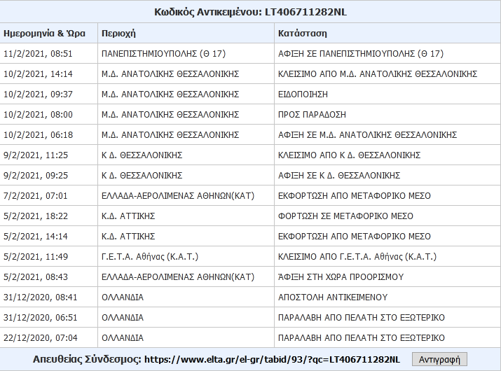 micos000 Δημοσ. 11 Μαρτίου 2021 Δημοσ. 11 Μαρτίου 2021 (επεξεργασμένο) Χτύπησε το tracking number στο elta gr. Το γράφει κάτω-κάτω στην εικόνα που σου δείχνει ο omokas. https://www.elta.gr/el-gr/εντοπισμόςαντικειμένου.aspx?qc=LT406711282NL Λένε ότι έχεις ειδοποιηθεί. Έλεγξε το γραμματοκιβώτιο μήπως έχει κανένα χαρτί που δεν πρόσεξες ή μήπως το πήρε κάποιος άλλος στο σπίτι. Επεξ/σία 11 Μαρτίου 2021 από micos000 1