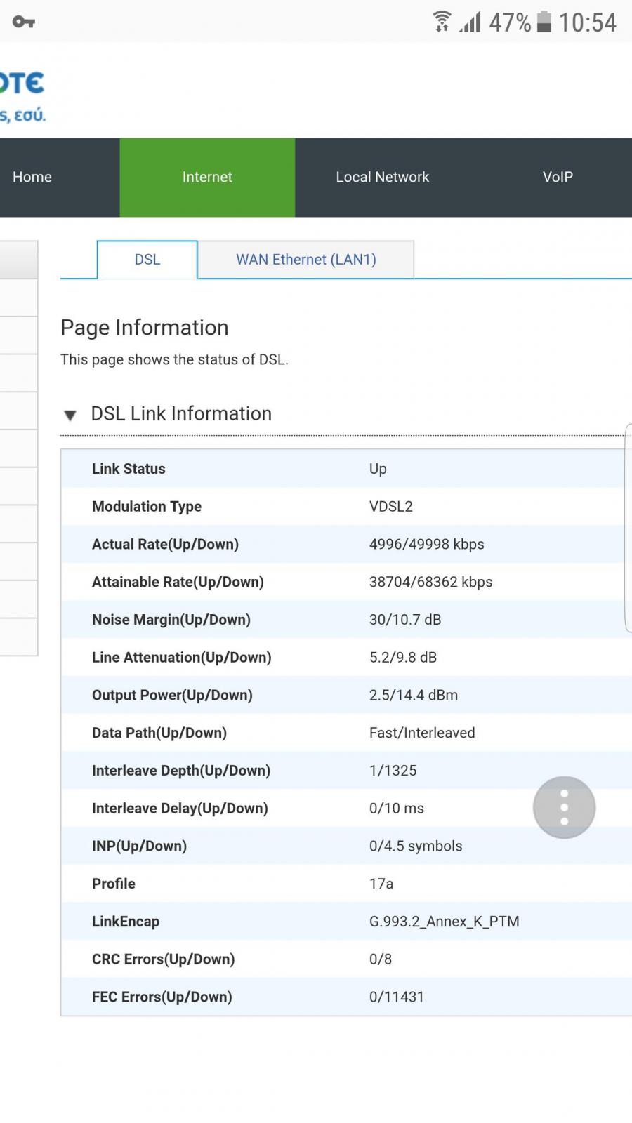 thephotoshoped Δημοσ. 14 Νοεμβρίου 2017 Δημοσ. 14 Νοεμβρίου 2017 Για να μην ανοίγω νέο θέμα. Σήμερα συνδέθηκα VDSL 50/5 στην COSMOTE. Αγίου Δημητρίου 160, Θεσσαλονίκη. Παρακαλώ δείτε τα αποτελέσματα των speed test και τα στοιχεία του ρουτερ και πείτε μου αν είναι οκ η χρειάζεται να κάνω αλλαγές. Το κατέβασμα μήπως είναι λίγο; Υπόψιν πως έγινε από τηλεόραση συνδεδεμένη με ethernet με το ρουτερ. Η καλωδίωση είναι η εξής : ένα μπλε καλώδιο τηλεφώνου συνδέεται στην πρίζα του τοιχου και σε ένα VDSL splitter. Από εκεί ένα καλώδιο πάει στο router στο dsl και ένα στο τηλέφωνο. *Update Μίλησα με τον ΟΤΕ και δηλώθηκε βλάβη διότι τα στατιστικά είναι χαμηλά όπως παραδέχθηκαν και οι ίδιοι. Μου είπαν ότι πρέπει να είναι τουλάχιστον 40-45 down. Ο συγχρονισμός βέβαια δείχνει άριστος.