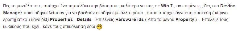 Mixalis_t Δημοσ. 3 Φεβρουαρίου 2018 Μέλος Δημοσ. 3 Φεβρουαρίου 2018 (επεξεργασμένο) Εν τω μεταξύ, πήρα στο κατάστημα όπου του έγινε αρχικά φορμάτ - upgrade σε win 7 για να ρωτήσω τον τεχνικό πως χειρίστηκε το θέμα με τους drivers...μήπως μου ξέφευγε κάτι Μου είπε ότι δεν κατέβασε ούτε εγκατέστησε κανένα driver. Ότι όλη τη δουλειά την έκανε καταβάζοντας και εγκαθιστώντας τα windows update?! Και ρωτάω: παίζει αυτό?? Γιατί μέχρι τώρα άλλα ήξερα εγώ. @ss13 αυτό που λες ήταν από τα πρώτα πράγματα που κοίταξα Για το λαπτοπάκι για το οποίο μιλάμε, φαίνεται ότι δεν υπάρχει καν επίσημη σελίδα!! Η asus, τουλάχιστον, έχει στη σελίδα της το ASUS Eee 1005PE, όπου φαίνεται ότι δεν είναι το ίδιο μοντέλο με το ASUS Eee 1005PEB που έχω στα χέρια μου. Τα drivers τα έχω κατεβάσει από τη σελίδα του πρώτου, επομένως ίσως εκεί να είναι το θέμα. Από την ASUS Hellas μου ζήτησαν το serial του μηχανήματος, έλα όμως που είναι ξυσμένο και δεν φαίνεται τίποτα.... Επεξ/σία 3 Φεβρουαρίου 2018 από Mixalis_t