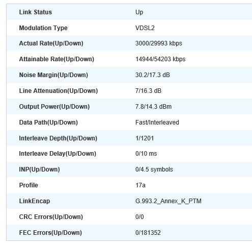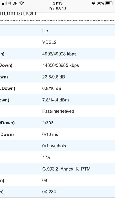 nikospagonis Δημοσ. 4 Φεβρουαρίου 2018 Δημοσ. 4 Φεβρουαρίου 2018 Καλησπερα Εδώ και 3 μερες εγινα και εγω επιτελους VDSL user. Στην περιοχη μου στην Κερκυρα μεχρι και πριν 4 μερες ειχα 3 mbps. Τωρα εχω ανετα τα 30 όπως φαινεται στα στατιστικα μου και το Attainable φαινεται καπου στα 54. Απλα για εσας που γνωρίζεται κατι παραπανω εχω τις εξης 3 ερωτησεις: Απλα να πω ότι παιρνω από καινουργιο καφαο και ότι επισης εχω καταργησει την εσωτερικη καλωδιωση του σπιτιου και φερνω ένα καλωδιο utp 6 και μπαινει κατευθείαν στο ρουτερ Speedport Entry 2i (δεν χρησιμοποιώ τηλεφωνο) πως σας φαινονται τα στοιχεια της γραμμης μου. Φαινονται λογικες οι μετρήσεις? Δεν εχει αποσυνδεσεις και ουτε αποκλεισεις στα SNR & Attenuation. Στο mycosmote μου δειχνει διαθεσιμοτητα για 100 αλλα με το attainable στα 54 πως θα το πιασει?