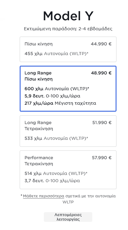 sattack Δημοσ. 11 Απριλίου 2024 Δημοσ. 11 Απριλίου 2024 (επεξεργασμένο) 1 ώρα πριν, alexiosdimitriadis είπε Σημαντική η διαφορά στην αυτονομία. Φτάνει στο ψυχολογικό όριο των 600km (wltp). Άραγε έχει LFP μπαταρία; Θα ήταν επίσης ενδιαφέρον να δούμε κάτι παρόμοιο και σε model 3. UPDATE: από ότι λέει εδώ έχει την ίδια μπαταρία (2170) με το LR AWD https://www.electrive.com/2024/04/11/tesla-launches-model-y-with-large-battery-and-rear-wheel-drive/#:~:text=The base version of the,the all-wheel drive models. 2 ώρες πριν, Droulas13 είπε Νέα έκδοση Model Y, σε σχέση με το AWD long range κερδίζεις 3.000 και 67 χλμ αυτονομίας και χάνεις έναν κινητήρα και λίγο επιτάχυνση. Σίγουρα είναι καλό να υπάρχουν πολλές επιλογές για όλους. Προσωπικά όμως δεν θα το προτιμούσα. Ή για λίγα χρήματα παραπάνω θα ξαναπαιρνα το AWD, ή θα έπαιρνα το SR για αρκετά λιγότερα χρήματα. ΥΓ. Στην Ελλάδα οι τιμές είναι 1.000Ε φτηνότερες από το Βέλγιο! Μπράβο!! Επεξ/σία 11 Απριλίου 2024 από sattack 1