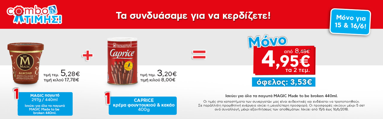 Genatos Δημοσ. 15 Ιουνίου 2018 Δημοσ. 15 Ιουνίου 2018 Magic παγωτό 440ml + Πουράκια Caprice 400g με 4,95€ στον ΑΒ Βασιλόπουλο 3 2
