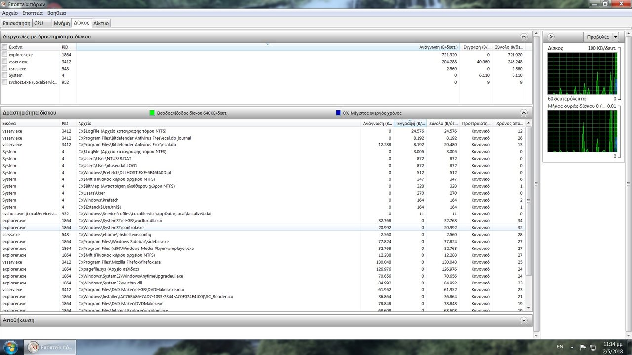 pavloa Δημοσ. 3 Μαΐου 2018 Μέλος Δημοσ. 3 Μαΐου 2018 (επεξεργασμένο) 7 ώρες πριν, micos000 είπε Αυτό που βλέπω είναι το vsserv.exe να σκανάρει αρχεία. Είναι από το bitdefender. Δες εδώ τι να κάνεις για να το "ελαφρύνεις". Ποιος δίσκος είναι και τι επεξεργαστή έχεις; Πάντως στο γράφημα χρήσης του δίσκου δε βλέπω κάτι τρομερό εκτός από peeks ανά τακτά διαστήματα. Το δοκίμασα και είδα πολύ μικρή βελτίωση. Αλλά κάνοντας αυτό, δεν έχω προστασία στο pc. Και στο άλλο Pc με τα ίδια χαρακτηριστικά το ίδιο antivirus έχω και δεν κολλάει. Έχω κάνει τεστ για τις ραμ και είναι μια χαρά. Όπως και για τον δίσκο 100%. western digital. Επεξ/σία 3 Μαΐου 2018 από pavloa