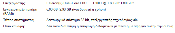 nik0laus Δημοσ. 23 Μαΐου 2018 Δημοσ. 23 Μαΐου 2018 (επεξεργασμένο) Αν μπορέσεις να αναβαθμίσεις και τον επεξεργαστή με κάποιον Core2Duo (π.χ Τ8100) θα δεις άλλο μηχάνημα , βρίσκεις με 10 ευρώ στις αγγελίες ... κατά τα άλλα όπως είπε και ο mphxths θελεις έκδοση 64μπιτ για να βλέπεις πάνω από 3 γιγαμπάιτ μνήμης ... Αν μας έλεγες και τον τύπο της μητρικής θα μπορούσαμε να σου πούμε αν αυτή υποστηρίζει πάνω από 4 γιγαμπάιτ (που μπορεί και να μην υποστηρίζει....) αν και για να βλέπει τα 6γίγα που έχεις εγκαταστήσει μάλλον θα υποστηρίζει μέχρι 8 με λειτουργικό 64μπιτ Επεξ/σία 23 Μαΐου 2018 από nik0laus 1