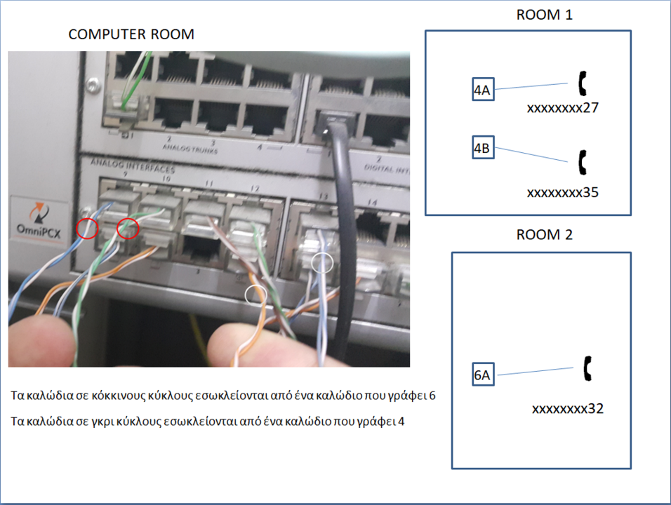 nikosfree12 Δημοσ. 19 Ιουνίου 2018 Δημοσ. 19 Ιουνίου 2018 Καλησπέρα σας, δεν ξέρω αν βρίσκομαι στη σωστή ενότητα αλλά προσπαθώ από το πρωί να βγάλω μία άκρη και δεν καταλαβαίνω τι φταίει. Στη δουλειά μου έχουμε τηλεφωνικό κέντρο syzefxis. Εγώ βρίσκομαι στο room 1 και μου αντιστοιχεί το τηλέφωνο που είναι συνδεδεμένο στην πρίζα 4Β και τελειώνει σε 35. Θέλω να κάνω τράμπα το τηλέφωνο που βρίσκεται στο room 2 με εμένα. Δηλαδή να έχω εγώ το 32 και ο υπάλληλος του room 2 το 35. Πήγα λοιπόν στο computer room και είδα αυτό που σας δείχνω στην φωτογραφία. Υπάρχει ένα μπλε καλώδιο το οποίο απέξω γράφει 6 και εσωκλείει τα καλώδια που έχω μαρκάρει σε κόκκινους κύκλους. Τα καλώδια που έχω σε γκρι κύκλους τα εσωκλείει ένα άλλο μπλε καλώδιο το οποίο γράφει απέξω 4. Αυτό που σκέφτηκα ήταν να κάνω τράμπα τα τέσσερα καλώδια. Δηλαδή τα γκρι να τα βάλω στη θέση των κόκκινων και τα κόκκινα στη θέση των γκρι. Δεν κατάφερα κάτι. Μπλέχτηκαν οι γραμμές μεταξύ τους και νομίζω ότι όταν κάλεσα το 32 χτύπησε στο 27. Έχει ιδέα κανείς τι συνδυασμό πρέπει να κάνω ή να μπλέξω με τεχνική βοήθεια του syzefxis? Ευχαριστώ εκ των προτέρων