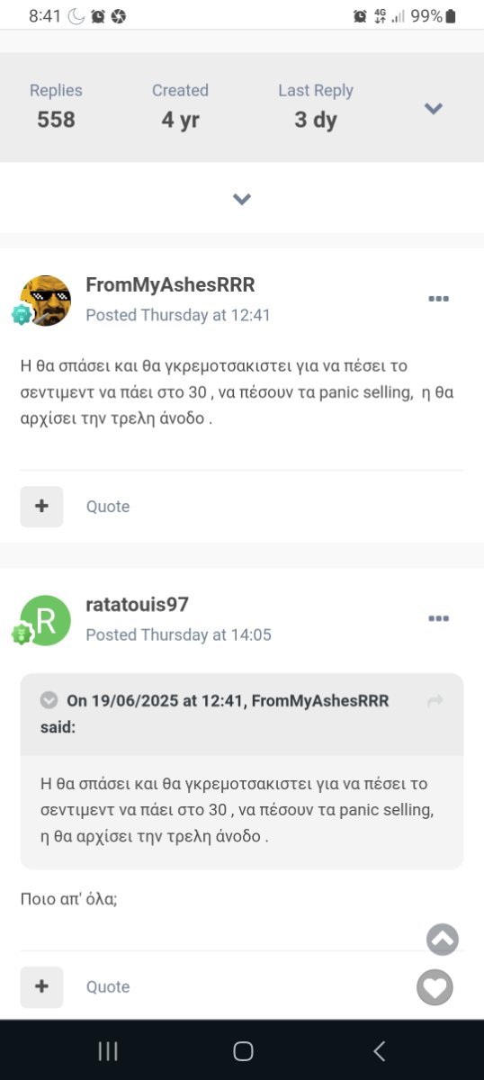 FromMyAshesRRR Δημοσ. 20 Ιουνίου Δημοσ. 20 Ιουνίου Όλο και περισσότεροι πλούσιοι αρχίζουν και μιλάνε για το ακατανόμαστο. Όταν βλέπεις, του υπερπλούσιους να μιλάνε σε εμάς τους φτωχούς και να μας λένε να το αγοράσουμε γιατί θα χάσουμε, ε τότε να αρχίζεις και να αναρωτιέσαι.....Γιά μισό λεπτό.....το ακατανόμαστο φτιάχτικε "ΚΑΙ ΚΑΛΑ" για να ξεφύγουμε απο τα πλοκάμια των πλουσίων....τώρα γιατί όλοι οι πλούσιοι μας λένε να το αγοράσουμε ; 1 hour ago, thomasG4 said: Για να ποστάρουν τέτοιες μα..... Καταλαβαίνω ότι είμαστε κοντά στο pump Δέν έχει angry φατσούλα και έβαλα confused..... Αλλα ναί....κοντά είμαστε..... 2 1