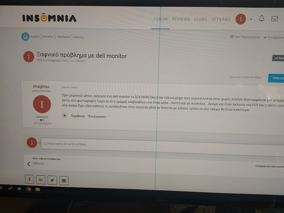 imaginas Δημοσ. 4 Νοεμβρίου 2018 Δημοσ. 4 Νοεμβρίου 2018 (επεξεργασμένο) Πριν μερικούς μήνες αγόρασα ένα dell monitor το S2418HN.Όλα ήταν τέλεια μέχρι πριν μερικά λεπτά,όπου χωρίς κανένα λόγο εμφάνισε μια γραμμή κάθετα...Θα τη δείτε στη φωτογραφία.Τώρα αυτή η γραμμή αναβοσβήνει και είναι μπλε...Λεπτή και με κουκίδες...Ακόμα και όταν έκλεισα τον Η/Υ και η οθόνη ήταν ανενεργή το ίδιο έκανε.Έχει ιδέα κάποιος τι συνέβη;Είναι στην εγγύηση αλλά αν λύνεται με κάποιο τρόπο να μην τρέχω θα ήταν καλύτερα. Επεξ/σία 4 Νοεμβρίου 2018 από imaginas