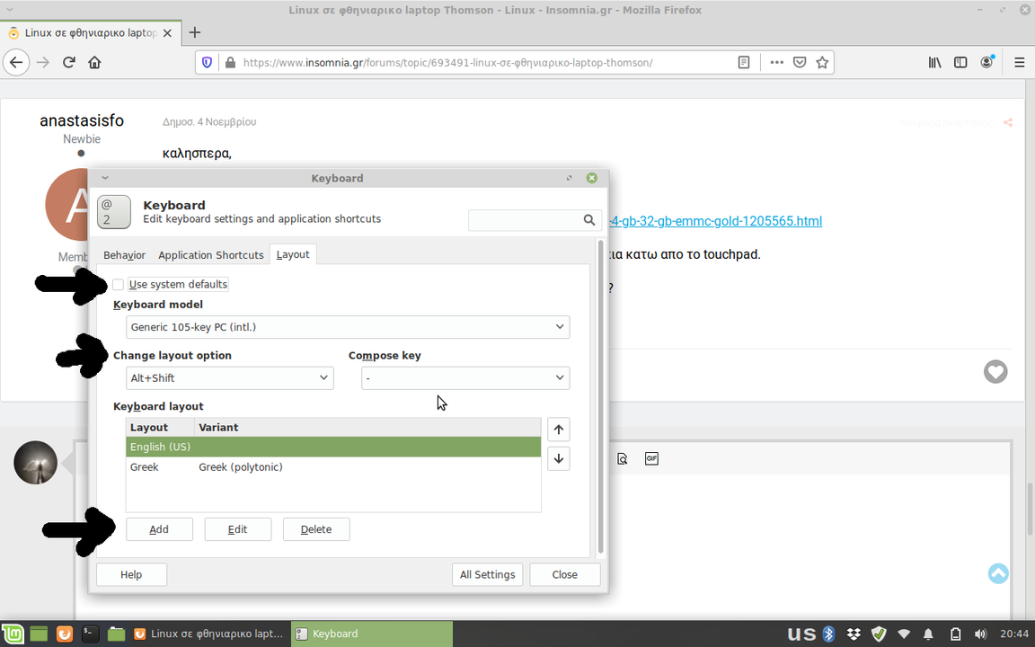 tuxpower Δημοσ. 10 Νοεμβρίου 2019 Δημοσ. 10 Νοεμβρίου 2019 (επεξεργασμένο) @ anastasisfo Menu --> system settings --> keyboard --> Layout uncheck use system defaults, add greek, και απο το change layout option διάλεξε alt+shift. Επεξ/σία 10 Νοεμβρίου 2019 από tuxpower