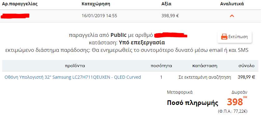 Επισκέπτης Δημοσ. 23 Ιανουαρίου 2019 Δημοσ. 23 Ιανουαρίου 2019 (επεξεργασμένο) Καλησπέρα. Πρόκειται για μια παραγγελία που έχω κάνει από Public. Αγόρασα με κάρτα αυτή την οθόνη : Οθόνη Υπολογιστή 32" Samsung LC27H711QEUXEN - QLED Curved ( και μετα από τηλ. επικοινωνία μου είπαν πως είναι το 32’’ μοντέλο άσχετα με τον κωδικό, καθώς με το email έχουν ότι σχέση έχουν και στο τηλεφωνικό κέντρο ΙΚΑ). · Τετάρτη 16/1/19 Έγινε η παραγγελια και κατάθεση στην τράπεζα πληρωμή. Περίμενα καθώς το προϊών ήταν ''κατόπιν παραγγελιάς'' μέχρι την Τρίτη 22/1/16. Δεν είχε αλλάξει τίποτα στην παραγγελία παρόλο που με είχαν ενημερώσει(το 1 και μοναδικό email από το κατάστημα μέχρι σήμερα) μόνο ότι έγινε η παραγγελία και θέλουν 2 -3 εργάσιμες για ενημέρωση ημερομηνία παράδοσης. · Παίρνω τηλέφωνο και ρωτάω για την εξέλιξη(21/1/19), και μου λένε πως έχουν στείλει email για να στείλω φωτογραφία την κάρτα με καλυμμένα τα στοιχεία κλπ. ( το οποίο δεν είχε έρθει ποτέ- ούτε spam) και ενώ τους ενημέρωσα ότι δεν το είχα λάβει ποτέ και θα ήθελα να μου προωθήσουν το συγκεκριμένο email, μου είπαν οκ. Άσχετα το ότι ακόμα το περιμένω… · Επόμενη μέρα και η αγγελία άλλαξε όπως είναι στην φωτογραφία. Γενικά έχω χαλαστεί πολύ με την εξυπηρέτηση πελατών γιατί δεν υπάρχει καμία συνεννόηση - ενημέρωση από μέρους τους. Να ακυρώσω και να σκάσω αλλά 45 - 50 και να την παραγγείλω από Eurosuplies που είναι ετοιμοπαράδοτη η θα έρθει κάποια στιγμή μέσα στον μηνά φοβάμαι ότι θα φάω άκυρο και θα περιμενω “τσάμπα” 1 μηνα. Επεξ/σία 23 Ιανουαρίου 2019 από Επισκέπτης