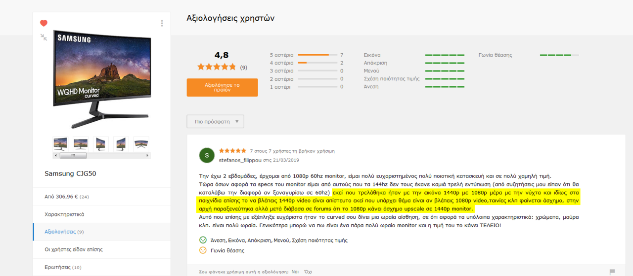 9-11 Δημοσ. 6 Απριλίου 2019 Δημοσ. 6 Απριλίου 2019 Ήμουν έτοιμος να postάρω στο «Βοήθεια / Προτάσεις αγοράς για οθόνες» μέχρι που έπεσε το μάτι μου στο παρόν νήμα. Φίλε SubGam3R είμαι κι εγώ σε αναζήτηση 27άρας οθόνης (που θα αντικαταστήσει μια Dell 2209WA 10ετίας!) έχοντας παραπλήσιες ανάγκες. Για εμένα προτεραιότητα έχει το βαθύτερο μαύρο (απαραίτητο για τη θέαση ταινιών), τα υπόλοιπα έπονται. Είχα σχεδόν καταλήξει στο Samsung που είδες εκ του σύνεγγυς στο Media Markt παρότι πλασάρεται ως gaming monitor κι εγώ δεν πολυασχολούμαι με παιχνίδια . Τα reviews σε καταστήματα εξωτερικού (π.χ. Amazon) ωστόσο απέχουν σε σχέση με τις κριτικές-5άστερα ακατέβατα των Ελλήνων κατόχων. Υποπτεύομαι πως κάποιοι από τους συμπατριώτες μας, λειτουργούν με τον ενθουσιασμό ενός user που μόλις απέκτησε τον 1ο του SSD «ανασταίνοντας» ένα computer που όδευε προς απόσυρση. Η χαώδης διαφορά ταχυτήτων SSD και HDD, δεν τους επιτρέπει να κρίνουν με διαύγεια, με αποτέλεσμα να γράφουν διθυράμβους για μοντέλα που απλώς κινούνται στον μέσο όρο ή και κάτω από αυτόν. Ευτυχώς υπάρχουν και αυτοί που δεν παρασύρονται, επισημαίνοντας και τα αρνητικά σημεία, όπως ο παρακάτω: Ειλικρινά, δεν είχα ΙΔΕΑ για το πρόβλημα των 1440p οθονών με το video upscale. Κι όχι τίποτα άλλο, αλλά το 99% των ταινιών & σειρών που παρακολουθώ εμπίπτουν σε αυτή ακριβώς την κατηγορία (1080p HEVC/H.265). Οι περισσότεροι αναφέρουν φαινόμενα ghosting ή/και κάνουν λόγο για το ιδιαίτερα χαλαρό quality control της Samsung (dead pixels -> επιστροφές -> λαχεία) Πέρα απ’ αυτό, βρίσκω ανεπαρκή τη βάση. Διαθέτει μόνο tilt και τίποτα άλλο, κάτι που μεταφράζεται σε extra έξοδα για βραχίονα. Τέλος πάντων, αν βγάλεις άκρη ή καταλήξεις κάπου, ανεξάρτητα από μάρκα/μοντέλο, γράψε τις εντυπώσεις σου για να σχηματίσουμε πιο ολοκληρωμένη εικόνα.