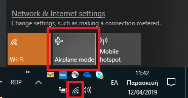 zncisnikos Δημοσ. 12 Απριλίου 2019 Μέλος Δημοσ. 12 Απριλίου 2019 1 ώρα πριν, asmilon είπε @micos000 Τα Windows 10 για υπολογιστες εχουν κανονικα λειτουργια πτησης, δεν ειναι κατι που περιοριζεται στα κινητα... @zncisnikos Για δες κατω δεξια εκει που ειναι η ζωνη της ημερομηνια/ωρας, πρεπει να βλεπεις ενα εικονιδιο του WiFi οπως φαινεται παρακατω. Μπορει να ειναι και εικονιδιο αεροπλανου. Αν κανει κλικ εκει βλεπεις το Airplane mode ανοικτο ή κλειστο; Τι γινεται οταν το πατησεις; Από ότι μου λέει έχει εξαφανιστεί τελείως το εικονίδιο του αεροπλάνου από τον υπολογιστή του.