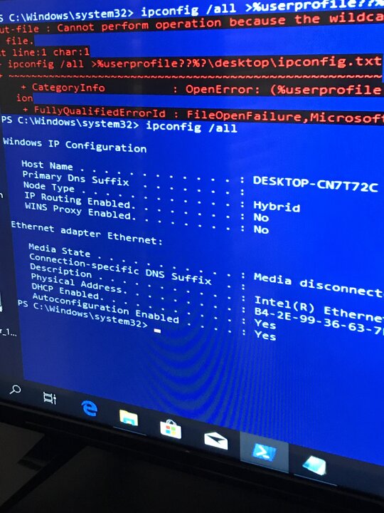 nikolas_kriti Δημοσ. 19 Απριλίου 2019 Μέλος Δημοσ. 19 Απριλίου 2019 3 ώρες πριν, micos000 είπε Αν βγάζει θαυμαστικό όταν κουμπώνει το καλώδιο τότε η κάρτα δουλεύει κανονικά οπότε κάτι άλλο φταίει. Κάνε δεξί κλικ στη σημαία της έναρξης και επέλεξε Powershell (Διαχειριστής) ή Γραμμή εντολών (Διαχειριστής), ότι έχει. Όταν ανοίξει δώσε το παρακάτω αφού έχεις συνδέσει το καλώδιο δικτύου και σου βγάλει Χ. ipconfig /all >%userprofile%\desktop\ipconfig.txt Θα σου σώσει στο desktop ένα txt αρχείο με το όνομα ipconfig. Κάνε copy-paste όλες τις πληροφορίες σε επόμενο μήνυμα. Δεν μ έτρεχε ολόκληρη η έντοκη! λεει κάτι αυτό ;;