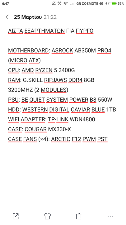 sotrous Δημοσ. 27 Απριλίου 2018 Δημοσ. 27 Απριλίου 2018 (επεξεργασμένο) 7 ώρες πριν, radiohead είπε https://www.priveshop.gr/product/11005992/EKSARTHMATA/KOYTIA-H-Y/ZALMAN-Z9-NEO-PLUS https://www.priveshop.gr/product/11006084/EKSARTHMATA/TROFODOTIKA/CORSAIR-CX450-80-BRONZE-CP-9020120-EU https://www.priveshop.gr/product/11006161/EKSARTHMATA/MHTRIKES/GIGABYTE-B360M-D3H-INTEL-B360-LGA-1151-SOCKET-H4-MICROATX-MHTRIKH-KARTA https://www.priveshop.gr/product/11005019/EKSARTHMATA/EPEKSERGASTES/INTEL-CORE-I5-8400-2-8GHZ-9MB-BOX https://www.priveshop.gr/product/11005476/EKSARTHMATA/MNHMES-RAM/G-SKILL-RIPJAWS-V-DDR4-16-GB-2-X-8-GB-DIMM-3200MHZ-F4-3200C16D-16GVKB https://www.priveshop.gr/product/11005765/EKSARTHMATA/SKLHROI-DISKOI/CRUCIAL-MX500-250GB-CT250MX500SSD1 https://www.priveshop.gr/product/11001074/EKSARTHMATA/SKLHROI-DISKOI/TOSHIBA-2TB-3-5-7-2K-SATA-6GB-S-DT01ACA200 https://www.priveshop.gr/product/11003377/EKSARTHMATA/KARTES-GRAFIKWN/ASUS-PH-GTX1050TI-4G-NVIDIA-GEFORCE-GTX-1050-TI-4GB https://www.priveshop.gr/product/15000025/LOGISMIKO/LEITOYRGIKA-SYSTHMATA/MICROSOFT-WINDOWS-10-PRO-64BIT-ENGLISH-DSP Radiohead σε ευχαριστώ πολύ, βλέπω ότι είναι πιο τύμπανο απο αυτό που σου εστειλα , αν προτιμήσω επεξεργαστή AMD RYZEN ποιον να βάλω και τι άλλο να αλλάξω ωστε να είναι συμβατό με amd ? επίσης θέλω να μου προτείνεις και εκτυπωτικο μεσαίας ημερήσιας χρήσης. Επεξ/σία 27 Απριλίου 2018 από sotrous