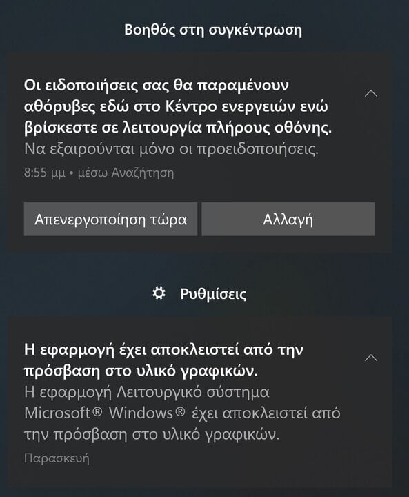 Doubt Δημοσ. 16 Ιουνίου 2019 Μέλος Δημοσ. 16 Ιουνίου 2019 NUC είναι με nvme ssd 26 λεπτά πριν, micos000 είπε Είσαι από πρόσφατο φορματ; Drivers για την κάρτα γραφικών πέρασες; Είσαι σαν διαχειριστής στα Windows ή σαν απλός χρήστης ή με περιορισμούς; Καμιά παραπάνω πληροφορία για το σύστημα σε επίπεδο hardware; Όλα είναι ενημερωμένα σύμφωνα με την Ίντελ 3 λεπτά πριν, jim_p είπε Αν κανεις οτι λεει ο micos000 απο πανω, δοκιμασε και αυτο που λεει εδω, στο βημα 3 https://www.thewindowsclub.com/application-blocked-accessing-graphics-hardware Θα το δω κι αυτό, ευχαριστώ.