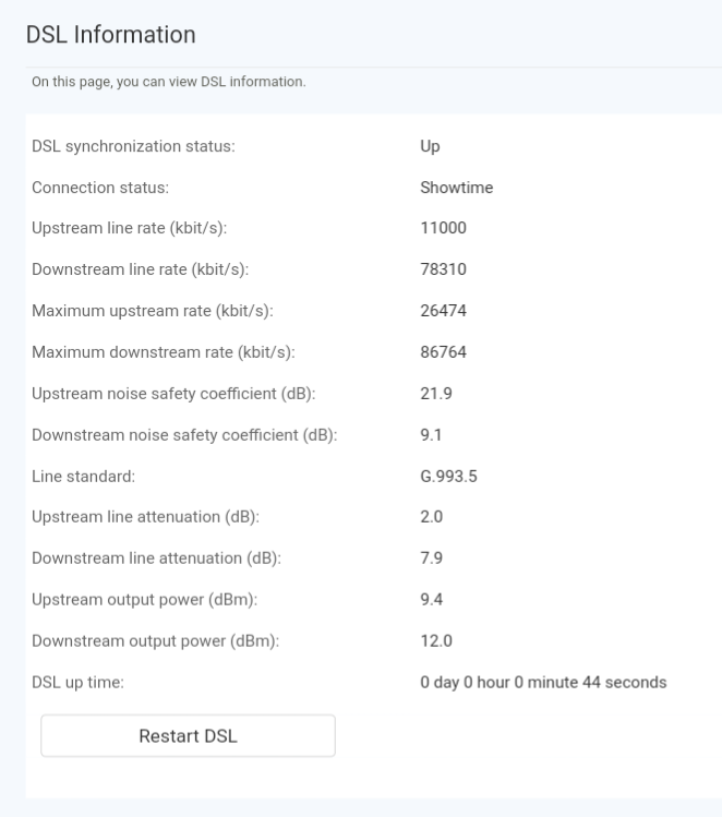 Kthulhou Δημοσ. 28 Φεβρουαρίου 2022 Δημοσ. 28 Φεβρουαρίου 2022 τεστ ταχύτητας (πρέπει) να κάνεις με καλώδιο ethernet. τα ασύρματα έχουν απώλειες, ανάλογα κ με τις συχνότητες, 2.4GHz, 5GHz, κλπ κλπ Link Status Up Modulation Type VDSL2_Vectoring Actual Rate(Up/Down) 11255/111776 kbps Attainable Rate(Up/Down) 48290/129020 kbps Noise Margin(Up/Down) 34.5/5.1 dB Line Attenuation(Up/Down) 7/6.1 dB Output Power(Up/Down) 9.4/14.4 dBm Data Path(Up/Down) Fast/Interleaved Interleave Depth(Up/Down) 1/8 Interleave Delay(Up/Down) 0/0 ms INP(Up/Down) 4/4 symbols Profile 17a Showtime Start 589 h 48 min 40 s LinkEncap G.993.2_Annex_K_PTM CRC Errors(Up/Down) 0/869 FEC Errors(Up/Down) 0/28833