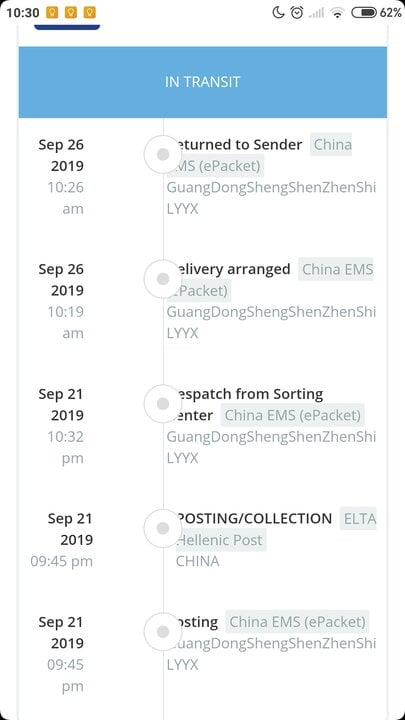 παραγγελία από τέλος Αυγούστου , ενώ μου είχε δώσει tracking number , μου ήρθε ειδοποίηση για update, μπήκα να δω και βλέπω επιστροφή στον αποστολέα.