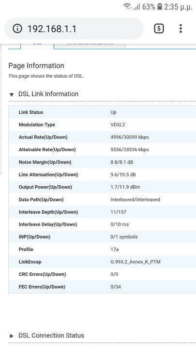 filipN Δημοσ. 14 Οκτωβρίου 2019 Δημοσ. 14 Οκτωβρίου 2019 21 ώρες πριν, FromDusk_TillDawn είπε Καλησπερα.Μετα απο αναβαθμιση σε 50αρα vdsl το ρουτερ δεν κλειδωνει ουτε καν στα μισα της ταχυτητας. Μετα απο τηλ στο οτε μου ειπαν οτι η περιοχη μου δε πιανει παραπανω απο 20 mbps μεχρι να γινει καποια αναβαθμιση,οποτε δε μπορει να γινει κατι,εγω ομως χθες δοκιμαζοντας και της 3 πριζες του σπιτιου πηρα 3 διαφορετικες ταχυτητες,με την πιο υψηλη να ειναι στα 30 download και 5 upload απλα η συγκεκριμενη πριζα δε βολευει καθολου λογο θεσης δωματιου και γυρισα στην πρωτη. Αυτο που θελω να μαθω ειναι οτι παιζει ο οτε να μου λεει βλακειες περι περιοχης κλπ και εγω απο τη μερια μου μπορω με καποιον ηλεκτρολογο να ανεβω σε ταχυτητα με προσωπικα μου εξοδα εννοειται. Εδω ειναι τα στατιστικα μου - Είναι πιθανόν να έπεσες σε υπάλληλο που προσπαθούσε να σε αποτρέψει να δηλώσεις βλάβη, δεν αποκλείεται όμως να είναι αυτή η κατάσταση στην περιοχή σου. Όπως και να έχει το έως 50Mbps από Α/Κ (αστικό κέντρο), για πολλές περιοχές είναι στην πράξη έως 30Mbps. - Από τη στιγμή που πιάνεις υψηλότερη ταχύτητα σε μία συγκεκριμένη πρίζα ή χρησιμοποιείς αυτή ή φέρνεις ηλεκτρολόγο να δει αν υπάρχει κάποια λύση με την εσωτερική σου καλωδίωση. 18 ώρες πριν, bill27 είπε Με τό attenuation που έχεις έπρεπε ο ΟΤΕ νά μήν σου δώσει 50αρι αλλά 30 αρι. Προφανώς το κάνανε για να σέ βάλουν σέ μεγαλύτερο πακέτο για να επωμιστούν περισσότερα χρήματα.Ζητα υποβάθμιση πακέτου με αναπροσαρμογή στην τιμή του συμβολαίου λόγω χαμηλού συγχρονισμου και διότι ή γραμμή σου δεν σηκώνει 50αρα. Με το ίδιο Line attenuation και σε VDSL από αστικό κέντρο, πολλοί έχουν ταχύτητα συγχρονισμού γύρω στα 35Mbps ή και περισσότερο. Εγώ πιάνω 35-37Mbps με το modem του ΟΤΕ και 39-41 με άλλο καλύτερο (αλλά δεκαετίας!) και με Noise Margin γύρω στο 9db.