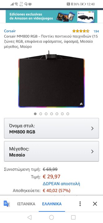 lionheart75 Δημοσ. 31 Οκτωβρίου 2019 Δημοσ. 31 Οκτωβρίου 2019 (επεξεργασμένο) Το Gaming RGB mousepad του τίτλου (Cloth edition / superficie paño) στα 49,46€ 39,21€ τελική (Thanks @DsLmAnIaC) τιμή στο Amazon.es. Link---> https://www.amazon.es/gp/product/B0759L45CG/ref=ox_sc_act_title_1 . >Ελλάδα το cloth version σε ένα μαγαζί από 58,20€ και στα υπόλοιπα από 65,70€, χωρίς να υπολογιστούν μεταφορικά: Skroutz: https://www.skroutz.gr/s/13416736/Corsair-MM800-RGB-Polaris-Cloth-Edition.html Bestprice: https://www.bestprice.gr/item/2155650415/corsair-mm800-rgb-polaris-cloth-edition-medium.html?seq=1 (Με βάση το ιστορικό τιμών του skroutz έχει παίξει πριν 6 μήνες (30 Απριλίου) στα 46€.) . >Εξωτερικό (Ευρώπη) το cloth version από 50-51€: https://geizhals.eu/corsair-gaming-mm800-rgb-polaris-mauspad-ch-9440021-eu-a1680194.html https://www.idealo.de/preisvergleich/OffersOfProduct/5802732_-gaming-mm800c-rgb-polaris-corsair.html . >Review: Επεξ/σία 2 Νοεμβρίου 2019 από lionheart75 3