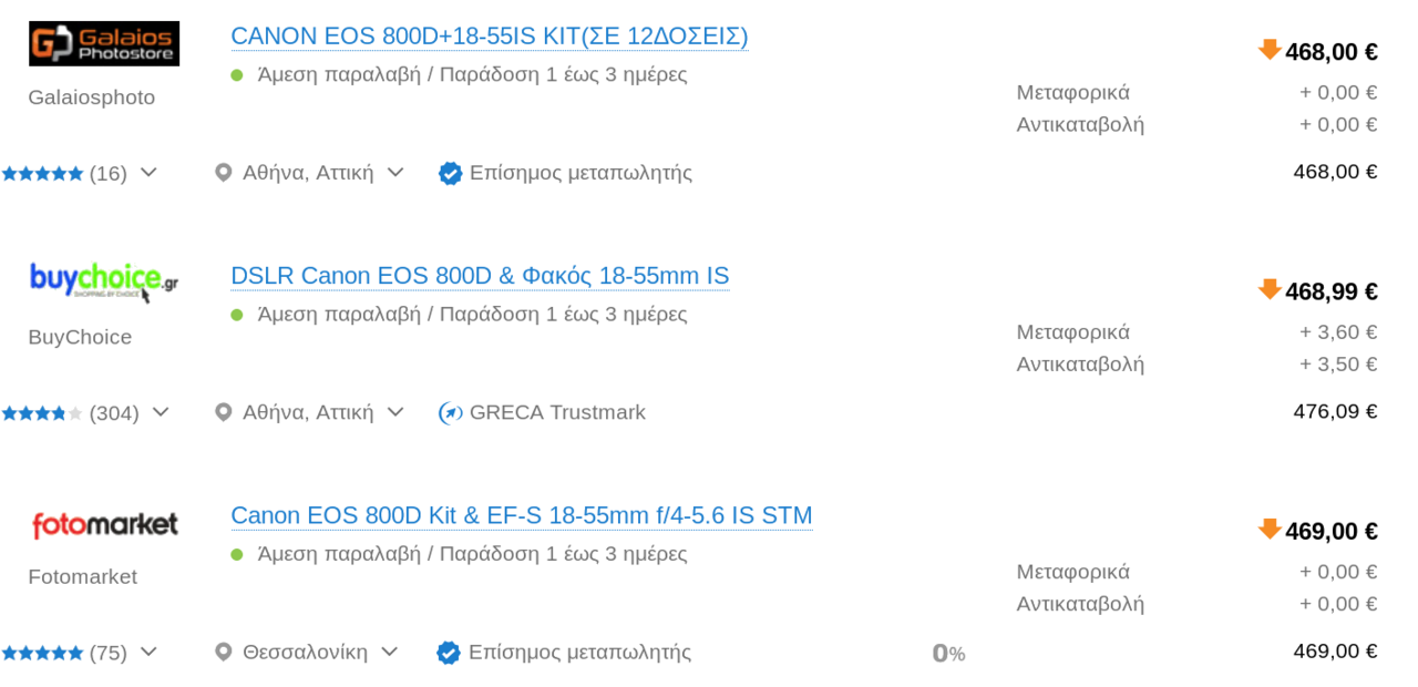 k_dinos Δημοσ. 23 Νοεμβρίου 2019 Δημοσ. 23 Νοεμβρίου 2019 Λογικά είναι promo της canon γιατί όλοι τόσο την έχουν, δεν παύει όμως να είναι μια πάρα πολύ καλή προσφορά. https://www.mediamarkt.gr/el/product/_canon-eos-800d-με-φακό-18-55mm-is-1195902.html Από ιστορικό του skroutz παίζει κοντά σε 560€ σε 'grey market' καταστήματα. Ο φακός που έχει πάνω λογικά είναι η έκδοση STM