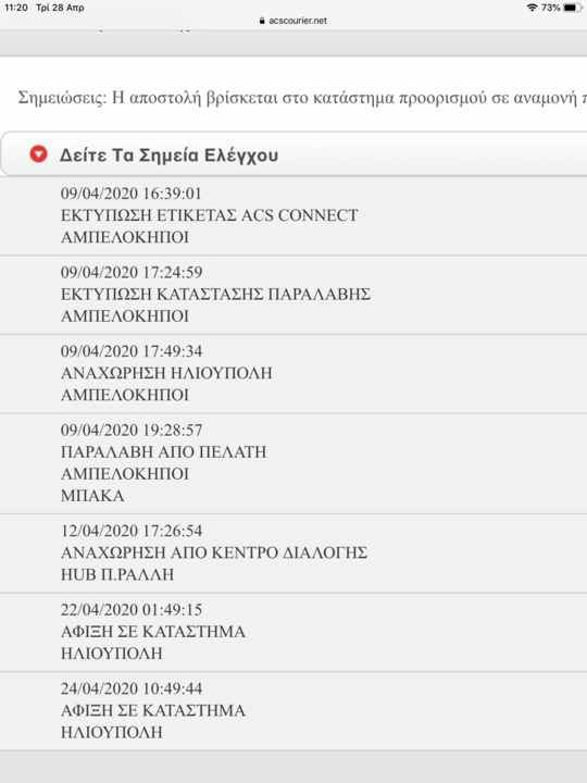 lak10 Δημοσ. 28 Απριλίου 2020 Δημοσ. 28 Απριλίου 2020 με speedex εφυγε απο ελευσινα 21/4 και ηρθε 27/4 Καστορια μια χαρα ειμαι
