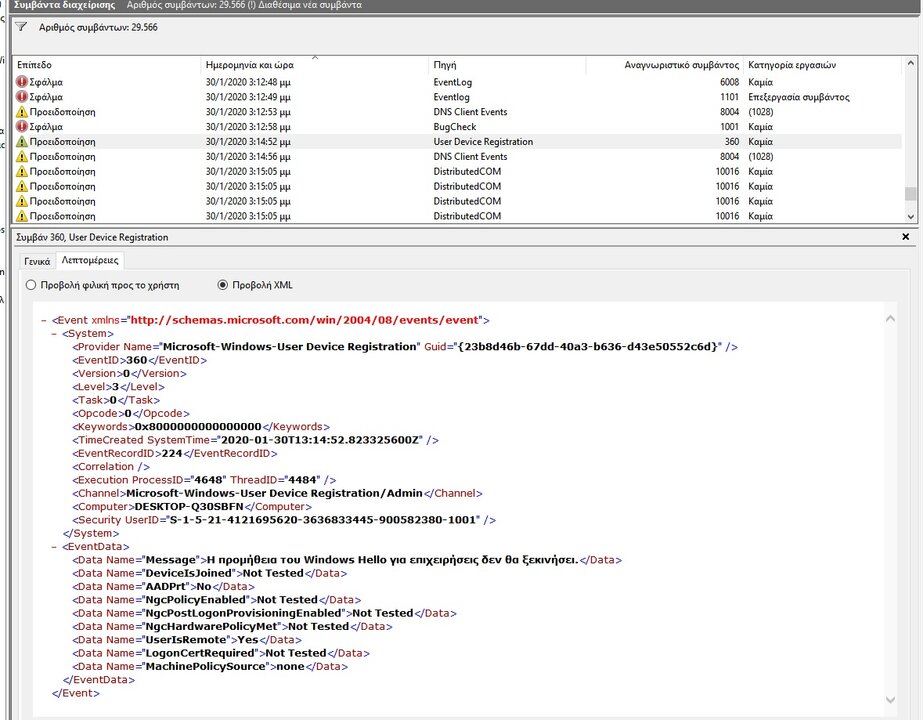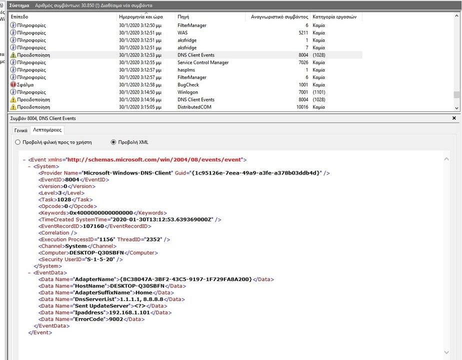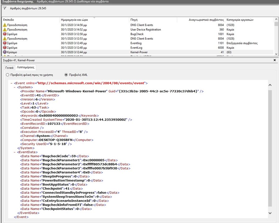 snbblp Δημοσ. 31 Ιανουαρίου 2020 Δημοσ. 31 Ιανουαρίου 2020 (επεξεργασμένο) 13 ώρες πριν, dkstopo είπε τελικά κοιτώντας βάση της ημερομηνιας και ωρας των κρασαρισματων είδα ότι να συμαβαινουν πάντα αυτα που φαινονται στο screenshot Αυτό που δείχνεις είναι το αποτέλεσμα (3B), όχι η αιτία (C05). Η αιτία είναι access violation 0ΧC0000005 από driver. Δείξε μου λίγο το DNS client events και το user device registration. Επεξ/σία 31 Ιανουαρίου 2020 από snbblp