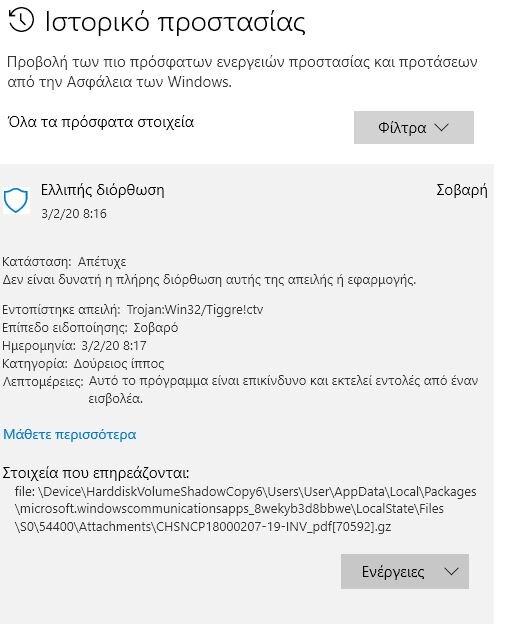 kosmous Δημοσ. 3 Φεβρουαρίου 2020 Δημοσ. 3 Φεβρουαρίου 2020 Στις πληροφορίες του defender έχει την παρακάτω διαδρομή την οποία όμως δεν μου την βγάζει στον explorer. : file: \Device\HarddiskVolumeShadowCopy6\Users\User\AppData\Local\Packages\microsoft.windowscommunicationsapps_8wekyb3d8bbwe\LocalState\Files\S0\54400\Attachments\CHSNCP18000207-19-INV_pdf[70592].gz Στις ενέργειες μου δίνει μόνο την επιλογή : Επιτρέπεται . Το μόνο που έχω εγκαταστήσει τελευταία είναι ένα πολυμηχάνημα epson με εγκατάσταση μέσα από την epson καθώς δεν είχε cd . Δεν προχωράει ούτε το πρόγραμμα αυτόματων αντιγράφων ασφαλείας καθώς λέει βρίσκει ανεπιθύμητο αρχείο .