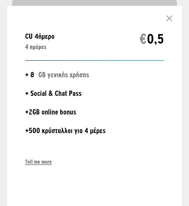 Επισκέπτης Δημοσ. 27 Φεβρουαρίου 2020 Δημοσ. 27 Φεβρουαρίου 2020 (επεξεργασμένο) Tell me more! Μπορείς να ενεργοποιήσεις το πακέτο από 26/2/20 μέχρι 2/3/20. Το πακέτο έχει ισχύ για 4 ημέρες από την ενεργοποίηση του. Σε περίπτωση που έχεις υπολειπόμενα δεδομένα από άλλα πακέτα, προτεραιότητα στην κατανάλωση έχουν τα δεδομένα που λήγουν νωρίτερα. Με το πακέτο Social & Chat Pass έχεις 2GB για χρήση στα παρακάτω social media: Facebook, Twitter, Instagram, Tinder, Snapchat, Pinterest, Linkedin, Telegram, Facebook Messenger, Whatsapp, Viber, Vodafone Message+, Call+, Telegram! Προτεραιότητα στην κατανάλωση όταν χρησιμοποιείς τις παραπάνω εφαρμογές έχουν τα δεδομένα του συγκεκριμένου πακέτου. Πρέπει να έχεις διαθέσιμα MB για Internet στο κινητό για να χρησιμοποιείς το Social & Chat Pass. Τα διαθέσιμα ΜΒ μπορούν να προέρχονται από οποιοδήποτε data πακέτο/υπηρεσία. Σε περίπτωση που θέλεις να ξανά αγοράσεις το πακέτο και δεν έχεις καταναλώσει τα προηγούμενα MB του πακέτου, τότε τα υπολειπόμενα MB που είχες χάνονται και δεν μεταφέρονται για χρήση με το νέο πακέτο. Το πακέτο ισχύει και για χρήση κατά την περιαγωγή (Roaming) εντός της Ευρωπαϊκή Ένωση με όριο πολιτικής ορθής χρήσης 717 ΜB. Μετά την κατανάλωση των ενσωματωμένων MB και εφόσον δεν υπάρχουν υπολειπόμενα MB από άλλα πακέτα, η χρέωση εντός ΕΕ είναι 0,00434€/ΜΒ συμπ. ΦΠΑ. Οι τιμές περιλαμβάνουν Φ.Π.Α και τέλη κινητής. Το πακέτο δεν ισχύει για χρήση εκτός Ε.Ε. Για FAQs σχετικά με το Social & Chat Pass μπες εδώ: https://www.vodafonecu.gr/faqs-new-cu-pass-/ https://www.vodafonecu.gr/paketa/inner/cu-4imero/ Επεξ/σία 27 Φεβρουαρίου 2020 από cacofonix-3