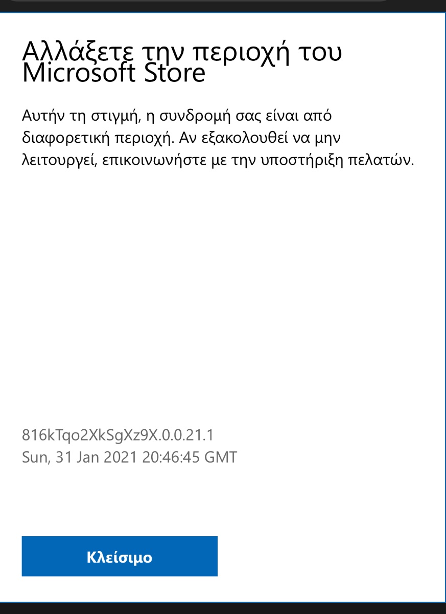 "Η περιοχή στην οποία αγοράσατε τη συνδρομή σας και η περιοχή του Store πρέπει να ταιριάζουν. Αν η αλλαγή της περιοχής του Store δεν λειτουργεί, επικοινωνήστε μαζί μας στην Υποστήριξη της Microsoft."