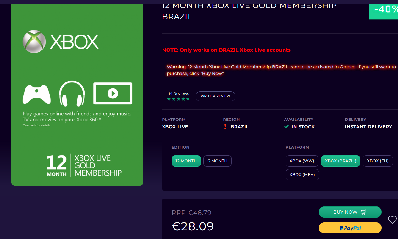 Σημείωση για όλους τους γάτους του Forum. Η 12μηνη Brazil ξανά κάτω από 30€ https://www.cdkeys.com/xbox-live/memberships/12-month-xbox-live-gold-membership-xbox-one-360-brazil
