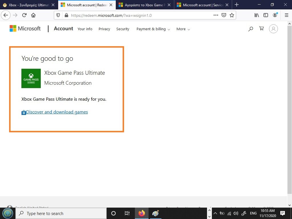 Αδειασμα των Cookies του φυλλομετρητη κλεισιμο φυλλομετρητη. Ξανα ανοιγμα αλλα με ελληνικη διευθυνση διαδικτυου. Συνδεση στο λογαριασμο account MS οπου γινεται και αγορα του Ultimate game pass. Το συστημα ενημερωνει οτι αναβαθμιζει την συνδρομη οπου η XBOX GOLD γινεται: