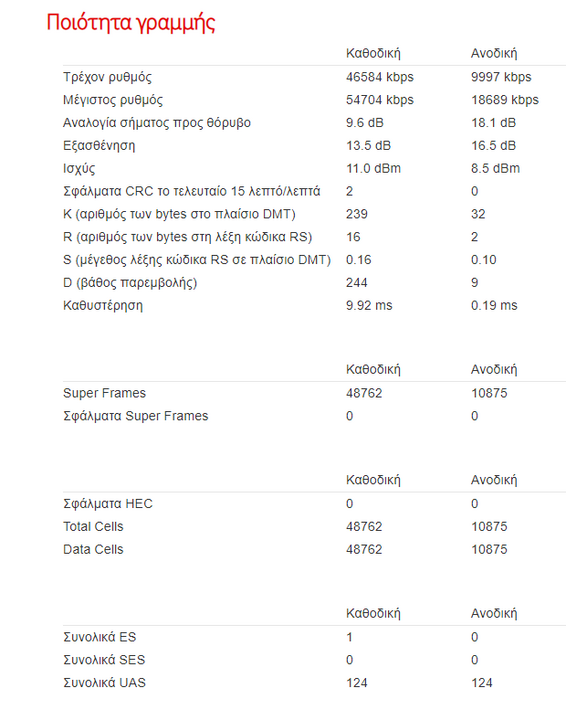 golden33 Δημοσ. 10 Μαρτίου 2020 Δημοσ. 10 Μαρτίου 2020 (επεξεργασμένο) Καλησπέρα παιδιά. Σήμερα έγινε η αναβάθμιση της γραμμής vodafone που έχω στο σπίτι σε 100Mbps. Αφενός το τηλέφωνο δεν λειτουργεί, αφετέρου το download είναι περίπου 45 αντί για 100 ενώ το upload είναι 9 και κάτι, δηλαδή σωστό. Μίλησα με την τεχνική υποστήριξη και θα με πάρουν τηλέφωνο για ραντεβού με τεχνικό. Επειδή όμως δεν το κατέχω και πολύ το θέμα, είπα να ποστάρω εδώ την εικόνα του router μήπως βλέπετε κάτι. Επεξ/σία 11 Μαρτίου 2020 από golden33