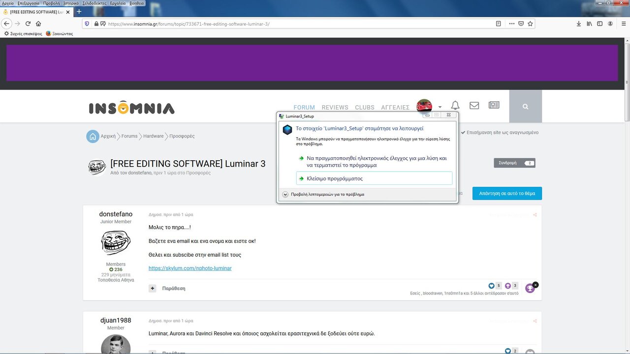 donstefano Δημοσ. 15 Μαρτίου 2020 Δημοσ. 15 Μαρτίου 2020 (επεξεργασμένο) Μολις το πηρα....! Βαζετε ενα email και ενα ονομα και ειστε οκ! Θελει και subscibe στην email list τους https://skylum.com/nphoto-luminar EDIT :μετα αφου βαλουμε τα στοιχεια μας στη σελιδα, ερχετε email.Εκει στο email πατας το λινκ για εγγραφη στο newsletter τους και μετα σου στελνουν το mail με το key και 2 λινκ για κατεβασμα.Ενα για WINDOWS και ενα για MAC. Επεξ/σία 16 Μαρτίου 2020 από donstefano 6 20