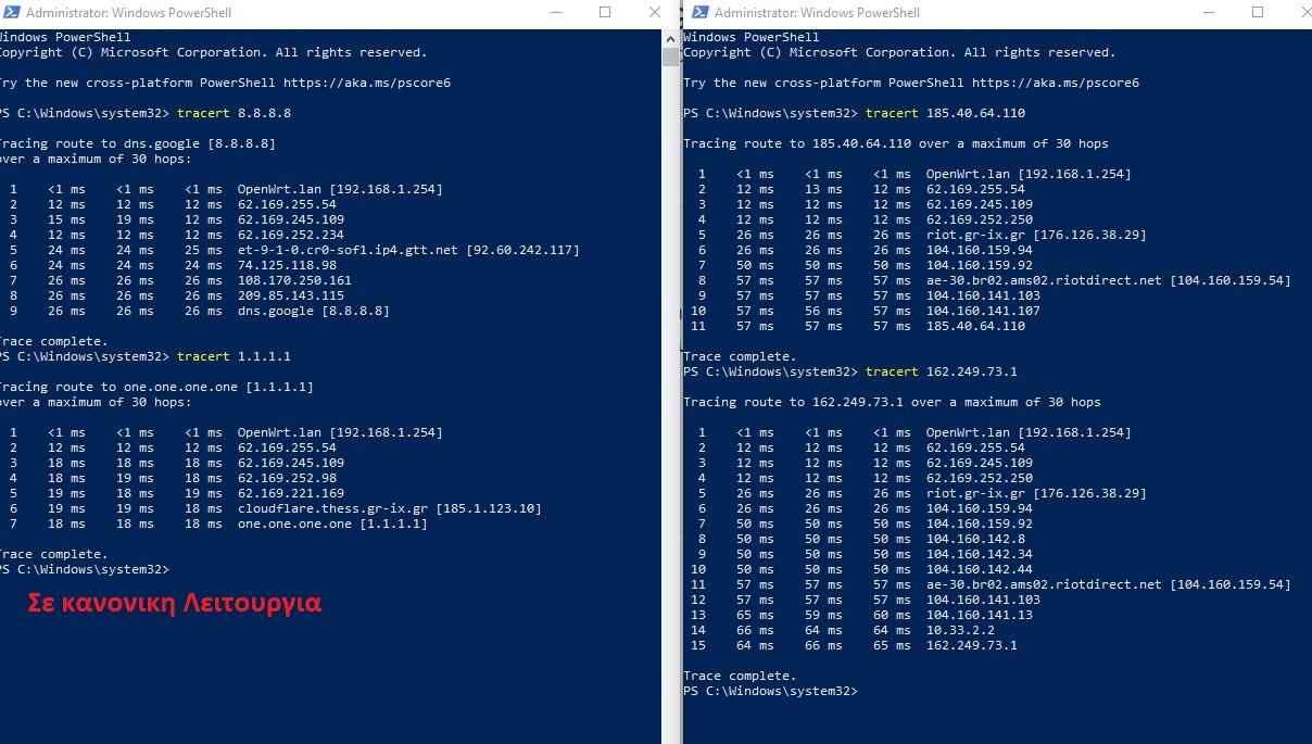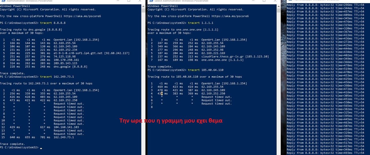 GlyfadaTech Δημοσ. 23 Μαρτίου 2020 Δημοσ. 23 Μαρτίου 2020 Καλημέρα και καλή εβδομάδα Ακολουθεί ερώτηση σχετική με IP και tracert κάθε βράδυ έχω θέμα με το νετ μου και τα ms είναι στο θεό και το πρόβλημα είναι ότι όλα τα tracert μου βγάζουν ip από Αμερική (δεν χρησιμοποιώ vpn) ο παροχος μου λέει ότι αυτό φταίει για το υψηλό ms που έχω της βραδυνές ώρες. Μπας και έχει κάνεις καμιά ιδέα τι μπορεί να παίζει σχετικά ; παραθέτω φωτογραφίες από tracert την ώρα που υπάρχει θέμα και την ώρα που η γραμμή είναι καθαρή PS το σταθερό δεν λειτουργεί από την μέρα που ξεκίνησε αυτό είναι μόνιμος νεκρό Και τα trace είναι σε 8.8.8.8 google , 1.1.1.1 cloudflare, και τους σερβερ του LOL eune με βάση τα δεδομένα που μου ζήτησε ο παροχος!