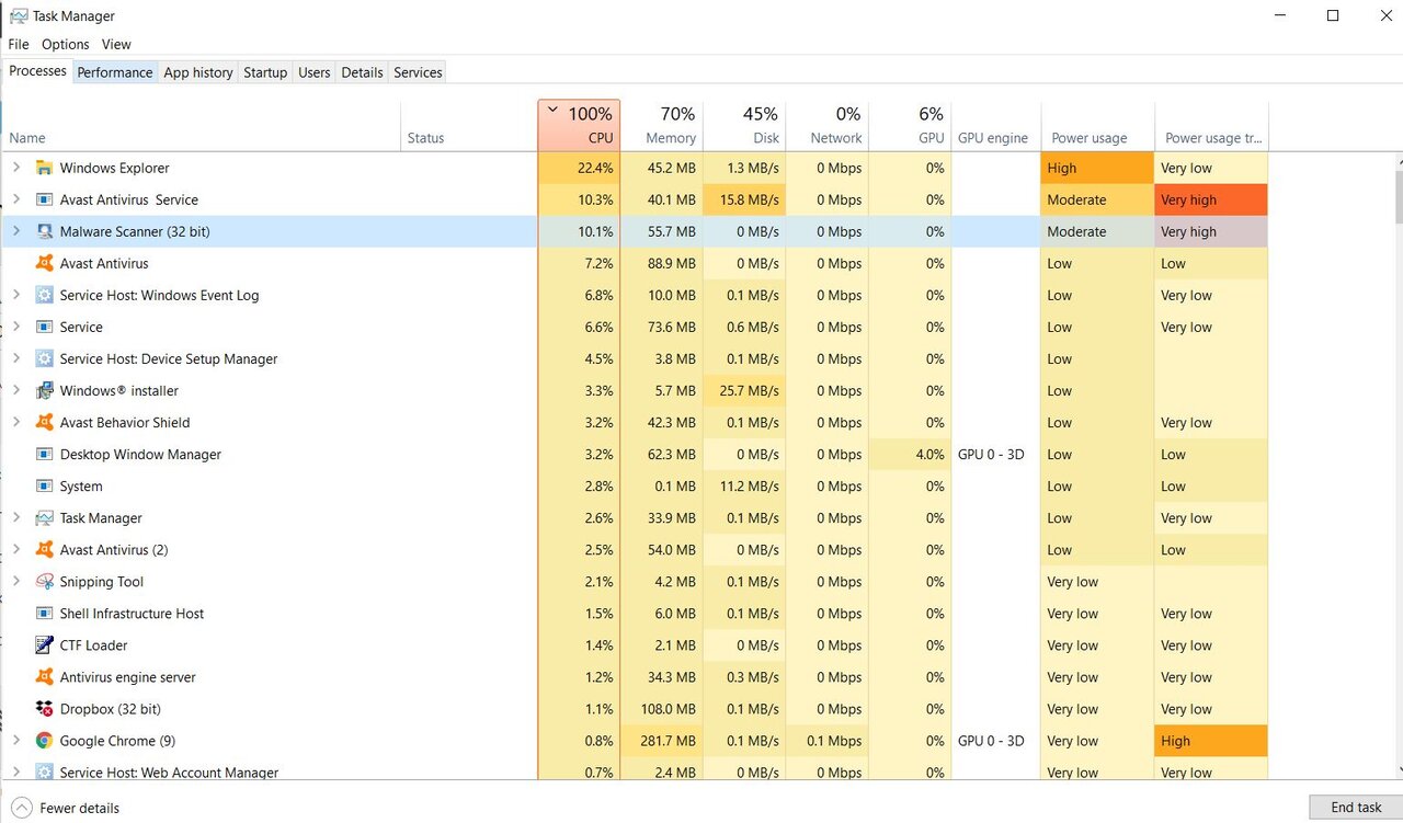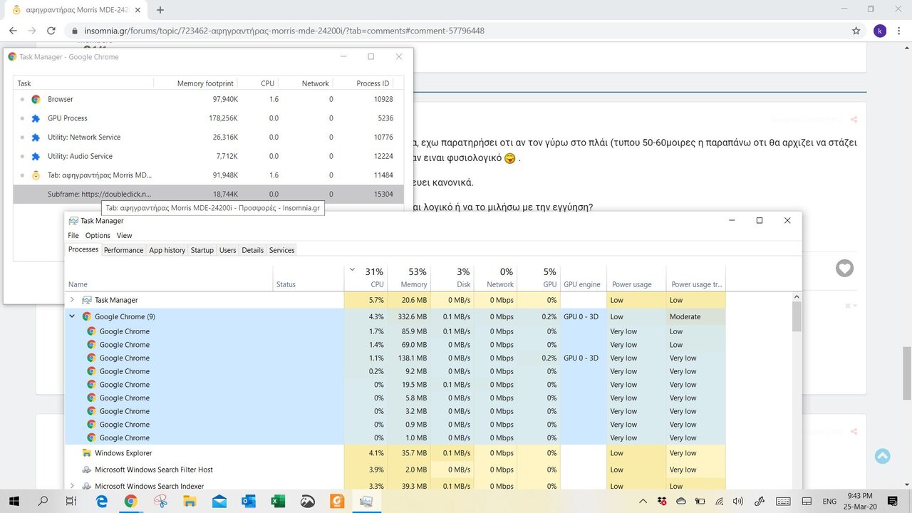 satsok2 Δημοσ. 25 Μαρτίου 2020 Δημοσ. 25 Μαρτίου 2020 (επεξεργασμένο) Γειά χαρά. Από χθες ο υπολογιστής καθυστερεί αρκετά, ο ανεμιστήρας δουλεύει συνέχεια και τρέχοντας το task manager βλέπω ότι η CPU έχει 100% χρήση. Ετρεξα με f12 το διαγνωστικό του συστήματος από το BIOS (πλήρη έλεγχο) και δεν υπάρχει κάποιο πρόβλημα. Εκανα ένα πλήρες scan με avast και spybot s&d και δεν έχω και εκεί κάτι. Εκανα επίσης update σε drivers. Καμία ιδέα τί μπορώ να κάνω; Και κάποιες ακόμα απορίες/στοιχεία αν βοηθούν: Στον chrome έχω μόνο ένα παράθυρο ανοιχτό αλλά μου εμφανίζει πολλά (βλ. screenshot). Εχω αφαιρέσει 2-3 extensions που είχα. Τι να φταίει; Να φταίει ότι βλέπω καμια 40αρια svchost ? Το μόνο που θυμάμαι να άλλαξα στον υπολογιστή είναι αυτή η βλακεία με το PIN της microsoft αλλά δεν μπορώ να κάνω rollback (και δεν έχω μάλλον κάτι πρόσφατο). Επεξ/σία 25 Μαρτίου 2020 από satsok2