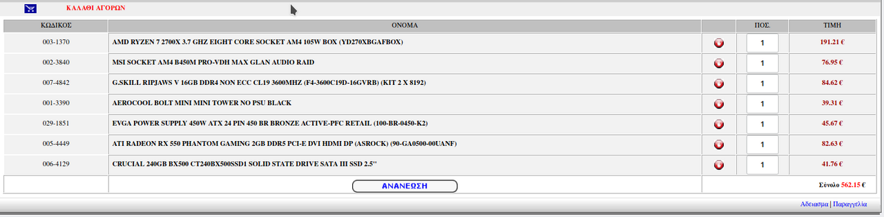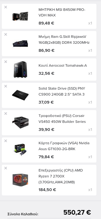 duffyduck Δημοσ. 2 Απριλίου 2020 Δημοσ. 2 Απριλίου 2020 (επεξεργασμένο) https://www.eshopcy.com.cy/psu-coolermaster-mwe-bronze-550w-p-PER.817926 https://www.eshopcy.com.cy/ssd-adata-xpg-sx6000-pro-256gb-m2-2280-pcie-gen3x4-p-PER.331574 https://www.eshopcy.com.cy/vga-kfa2-geforce-gt1030-2gb-gddr5-pci-e-retail-p-PER.512159 Επεξ/σία 2 Απριλίου 2020 από duffyduck