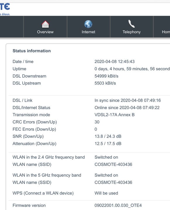 malias4 Δημοσ. 8 Απριλίου 2020 Δημοσ. 8 Απριλίου 2020 Μετα απο 14 μερες συνδεθηκα κ εγω σε 50αρα vdsl χθες το πρωι. Ανεβαζω μια τα στατιστικα μου να πειτε γνωμες κτλ. Απο τα λιγα που ξερω μου φαινεται πολυ καλη. Επειδη δεν μου ηρθε sms να βαλω το νεo ρουτερ του οτε οταν με γυρισαν απο τη voda ειχα το δικο τους router κουμπoμενο κ ειδα οτι το max atainable ειναι 67 mbps ( το speedport plus δεν το δειχνει αυτο) . Βλεπω ομως οτι εχω τωρα snr profile 13 ενω στην voda με adsl ειχα 9. Αυτο λογικα το εκαναν επειδη ουτως η αλλως τερματιζω τη γραμμη οποτε το αναβασαν για να μην εχω θορυβο κ errors ? Παρατηρησα οτι εχω 55 mbps download /5.5 upload οποτε κ αυτο το εχουν ανεβασει λιγο παραπανω απο τον Οτε; Επισης σημερα το πρωι που σηκωθηκα κατα τις 08:00 ειδα οτι γυρω στις 07:00 ειχε κανει επανεκινηση το router γιατι βλεπω οτι εχει uptime 5 ωρες . Για ποιο λογο ξα εκανε επανεκινηση ; Στις 5 ωρες λοιπον που εχει uptime δειχνει 30 crc errors. Τι ακριβως ειναι αυτα; Ακομα κ με wifi πιανω 51 mbps οποτε καλυτερα δεν γινετε πιστευω 😀 To ping μου ειναι γυρω στο 23-26 αν ζητησω fast path ποσο μπορει να παει ; Κ μετα θα εχω πχ παραπανω errors ; Η θα ειναι οκ ; ευχαριστω