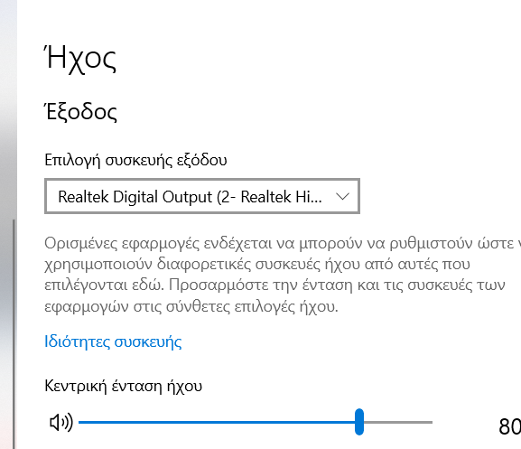 micos000 Δημοσ. 18 Απριλίου 2020 Δημοσ. 18 Απριλίου 2020 Εγώ θα επαναφέρω αυτό που σου είπαν και πριν. Δεν πρέπει να είναι digital η έξοδος αλλά speakers, headphones, analog ή κάτι τέτοιο. Κάνε αριστερό κλικ στην ένταση ήχου και δες μήπως έχει ένα βελάκι πάνω από την ένταση. Αν έχει πάτα το και δες τι επιλογές βγάζει.