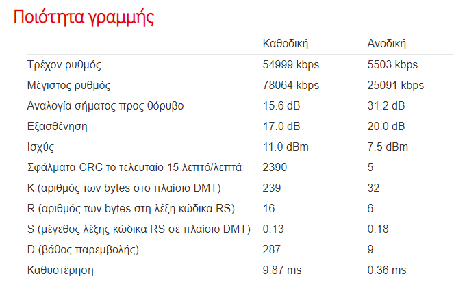 7nisiotis Δημοσ. 29 Απριλίου 2020 Δημοσ. 29 Απριλίου 2020 (επεξεργασμένο) ΟΚ εχω θέμα με τη καλωδίωση μου που ακόμα δεν εχω φτιάξει λόγω του ιού κλπ ώστε να ερθει ηλεκτρολόγος ή τεχνικός να περάσουμε 4 μ εξωτερική καθώς δεν εχω τις γνώσεις να το φτιάξω μόνος μου. Ήμουν 2.5 up/ 29 κατι down ( fast path , ενώ σε interleaved απλά 3αριζε το up )- αναβάθμισα το συμβόλαιο σε 50αρα, σήμερα έγινε επανεκκίνηση και επιασα τα παρακάτω αλλά χάθηκε το fast path, στέλνω μήνυμα να γίνει η αλλαγή πριν και τώρα έπεσα στα Τι λούσαν άσχημα? Πώς να τους ζητήσω εστω να μου δώσουν αυτά που είχα πριν μέχρι να διορθώσω το θέμα με τη γραμμή μου; Σημειώνεται οτι 2.5 / 29 down ενα μήνα+ τώρα δεν ειχε πέσει καθόλου (46 ημέρες) και γενικότερα δύο χρόνια τώρα δεν είχα καμία αποσύνδεση Επεξ/σία 29 Απριλίου 2020 από 7nisiotis